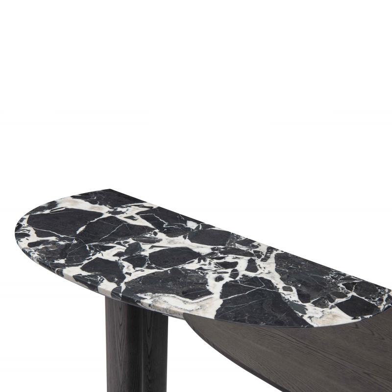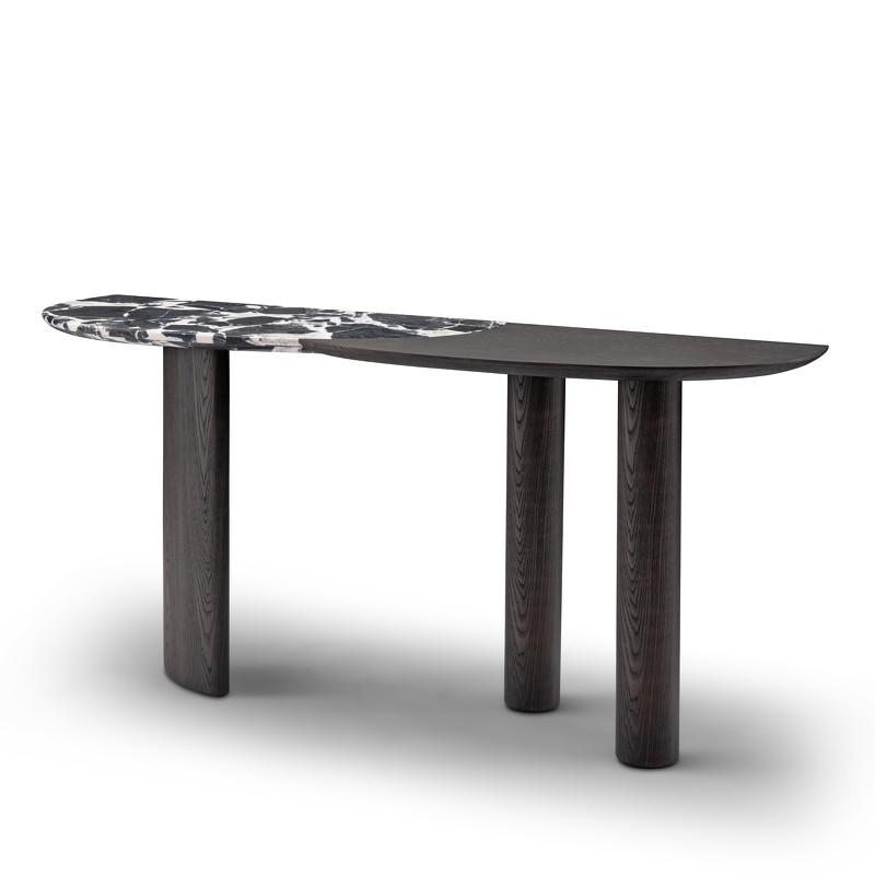 Консоль от итальянского бренда Fratelli Barri - роскошная модель в современном стиле, созданная с использованием передовых технологий мебельного производства и материалов исключительного качества. Консоль комбинированная, эффектно будет смотреться в интерьере гостиной или прихожей. Трехчастное основание консоли и асимметричная столешница округлых форм, выполнены в отделке черным мрамором Bulgari и темным шпоном вяза.