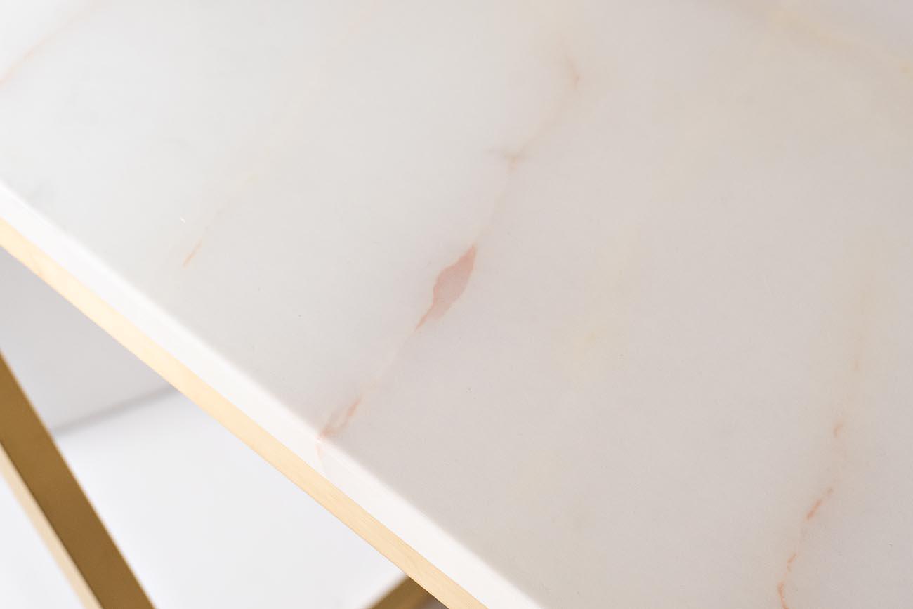 Материал - основание - нерж.сталь, цвет золото матовое; столешница - иск.мрамор (камень с полимерным покрытием)