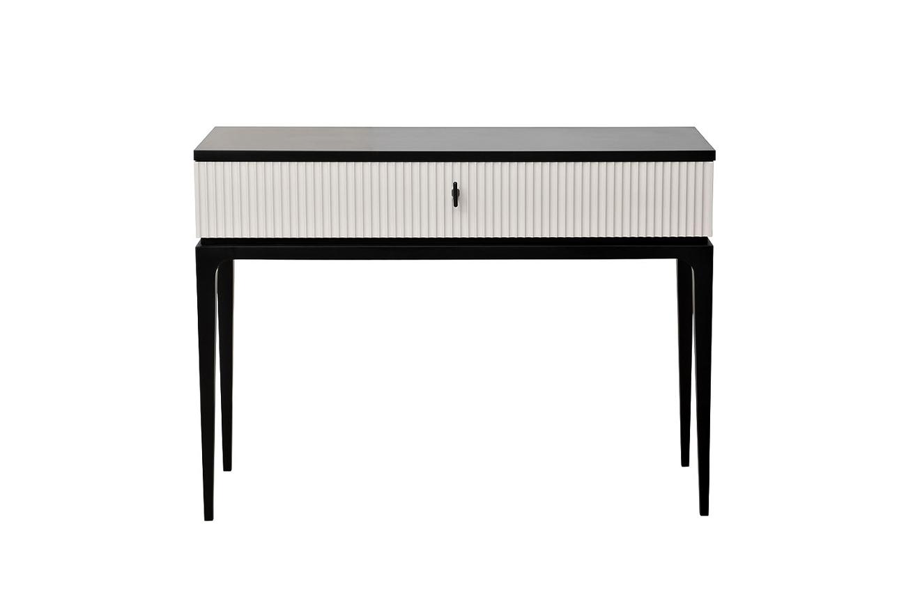 description-full - Дизайнерская консоль ESTE в современной стилистике отличается лаконичным дизайном и высокой функциональностью. Сочетание черного каркаса и светло-серой фактурной отделки ящика выглядит стильно и презентабельно. Изящная консоль в гостиной станет эффектным дополнением обстановки и станет отличным местом для хранения документов и важных мелочей. На столешнице будут уместно смотреться вазы, кашпо, шкатулки, фоторамки и прочий декор. В спальне черная-серая консоль отлично справится с функцией туалетного столика, если дополнить ее зеркалом. В прихожей она займет минимум места, но будет отличным решением для хранения ключей, аксессуаров. Черно/серая консоль ESTE с выдвижным ящиком. Габариты:ширина-109см,глубина-40см,высота-80см. RAL 9005/NSC 2002