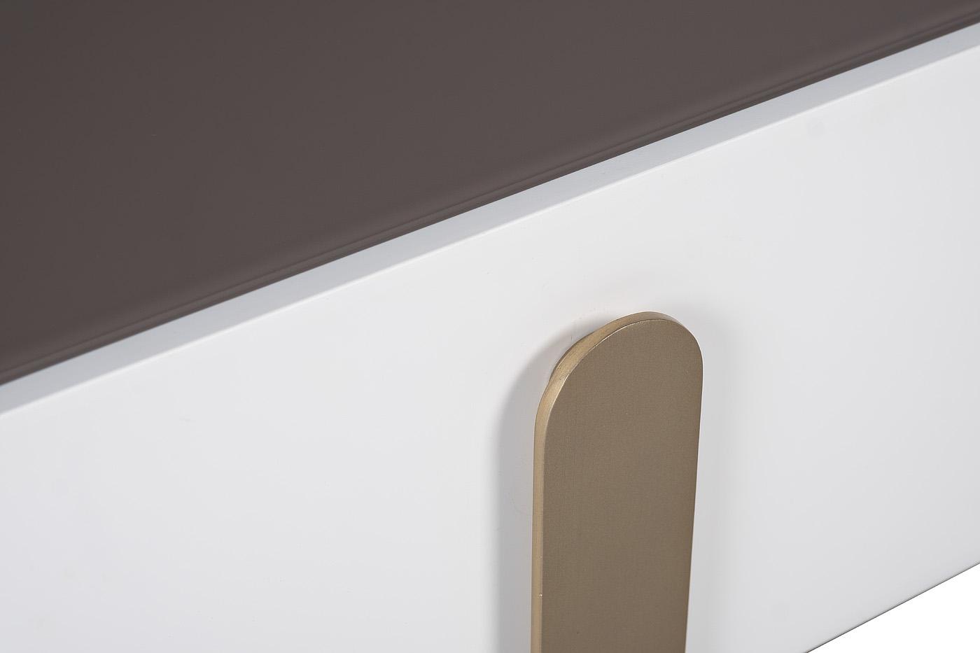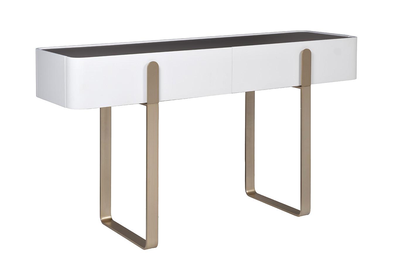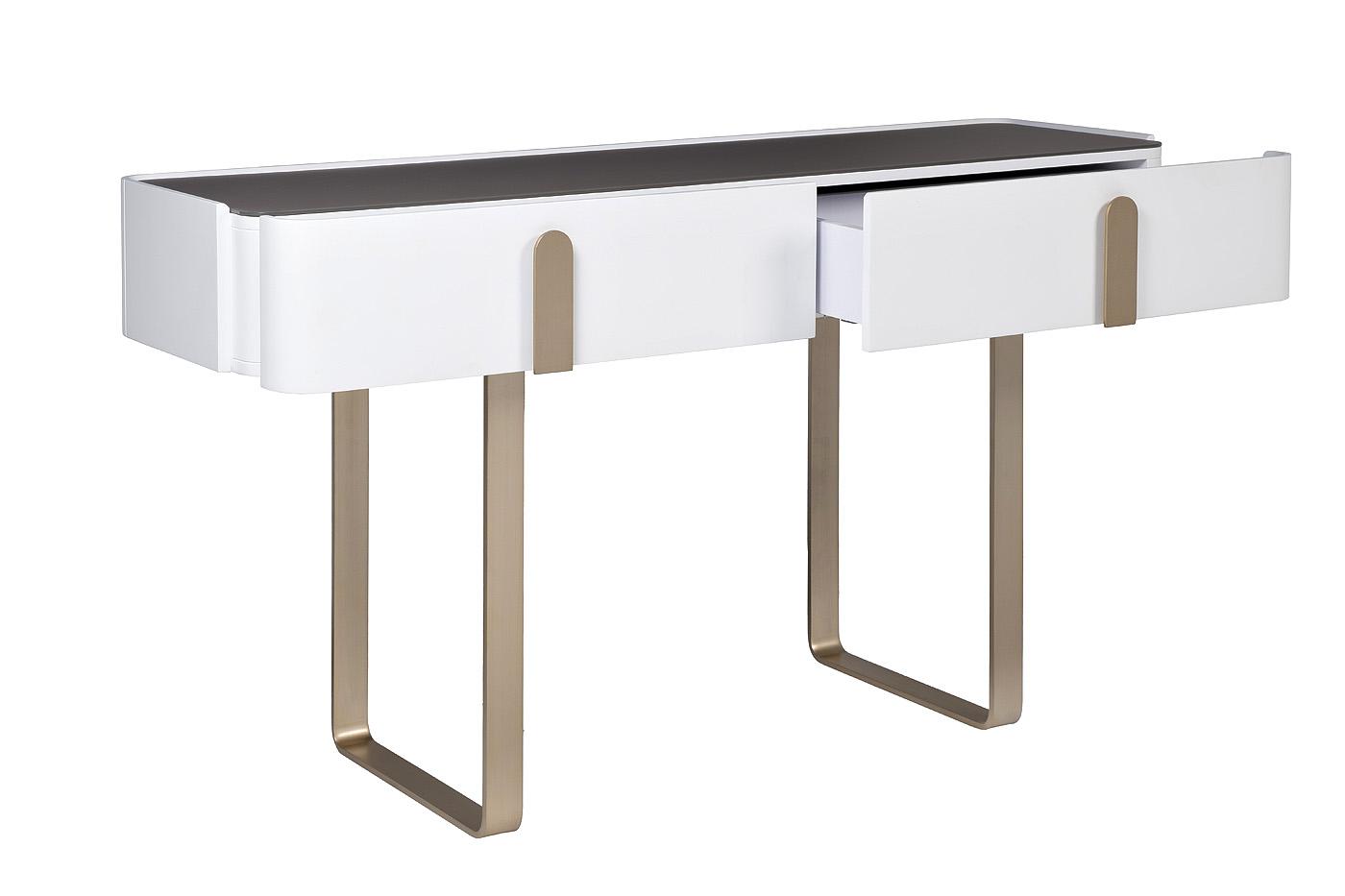 description-full - Элегантная и стильная консоль в белом цвете – отличное решение для помещений в современном дизайне. Модель имеет продолговатую форму со скругленными краями и плоскими ножками. Столешница выполнена из прочного стекла в темном цветовом решении, которое гармонично дополняет МДФ белого цвета. Мебель оснащена двумя скрытыми нишами с плоскими ручками, которые декоративно обыграны с формой ножек матового золотистого оттенка. Консоль от Garda Decor эффектно впишется в интерьер гостиной или спальни, занимая минимум места и предлагая дополнительное пространство для хранения личных вещей.