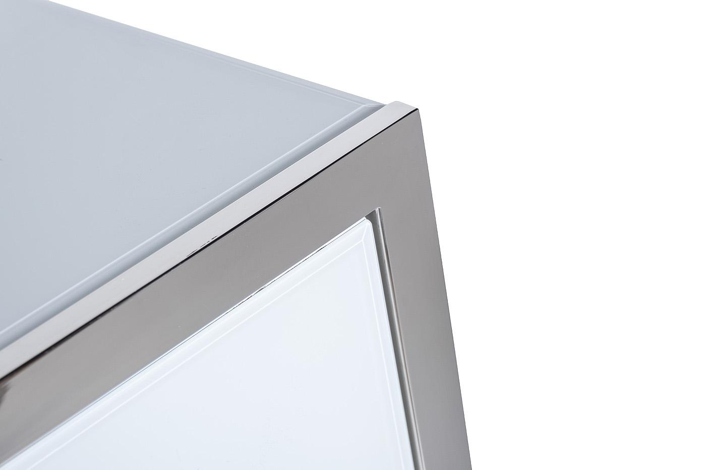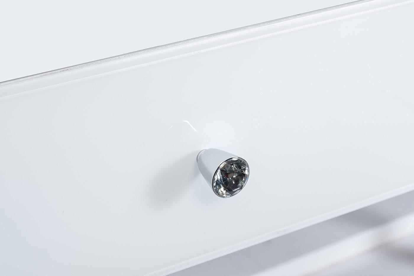 description-full - Элегантная и лаконичная тумба с фасадами и корпусом, отделанными белым стеклом, станет настоящей находкой для спальной комнаты, гостиной или прихожей в светлых тонах. Опора-каркас из полированной стали цвета хром заменяет привычные ножки и превращает консоль в модный дизайнерский предмет мебели. Два вместительных ящика подходят для хранения туалетных принадлежностей, косметики, лекарств и прочих мелочей. Нотку роскоши в дизайн стеклянной консоли добавляют граненые стеклянные ручки на фасадах ящиков. Консоль составит гармоничный ансамбль с прикроватными тумбочками схожего дизайна арт. KFG104 и зеркалами арт.KFG048, арт.KFE1120, арт.KFE1350, KFE1150/1.