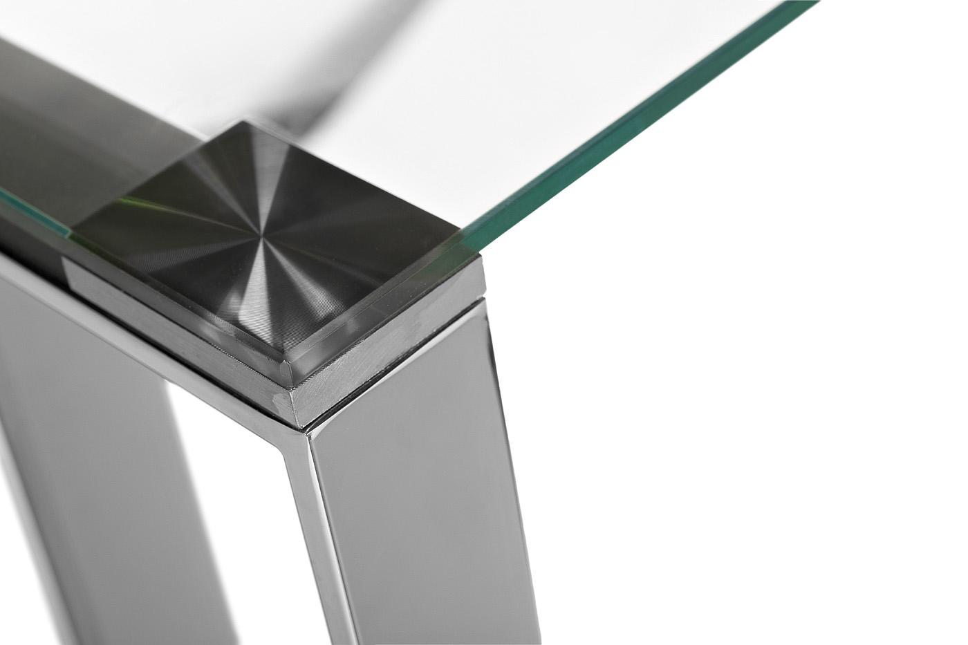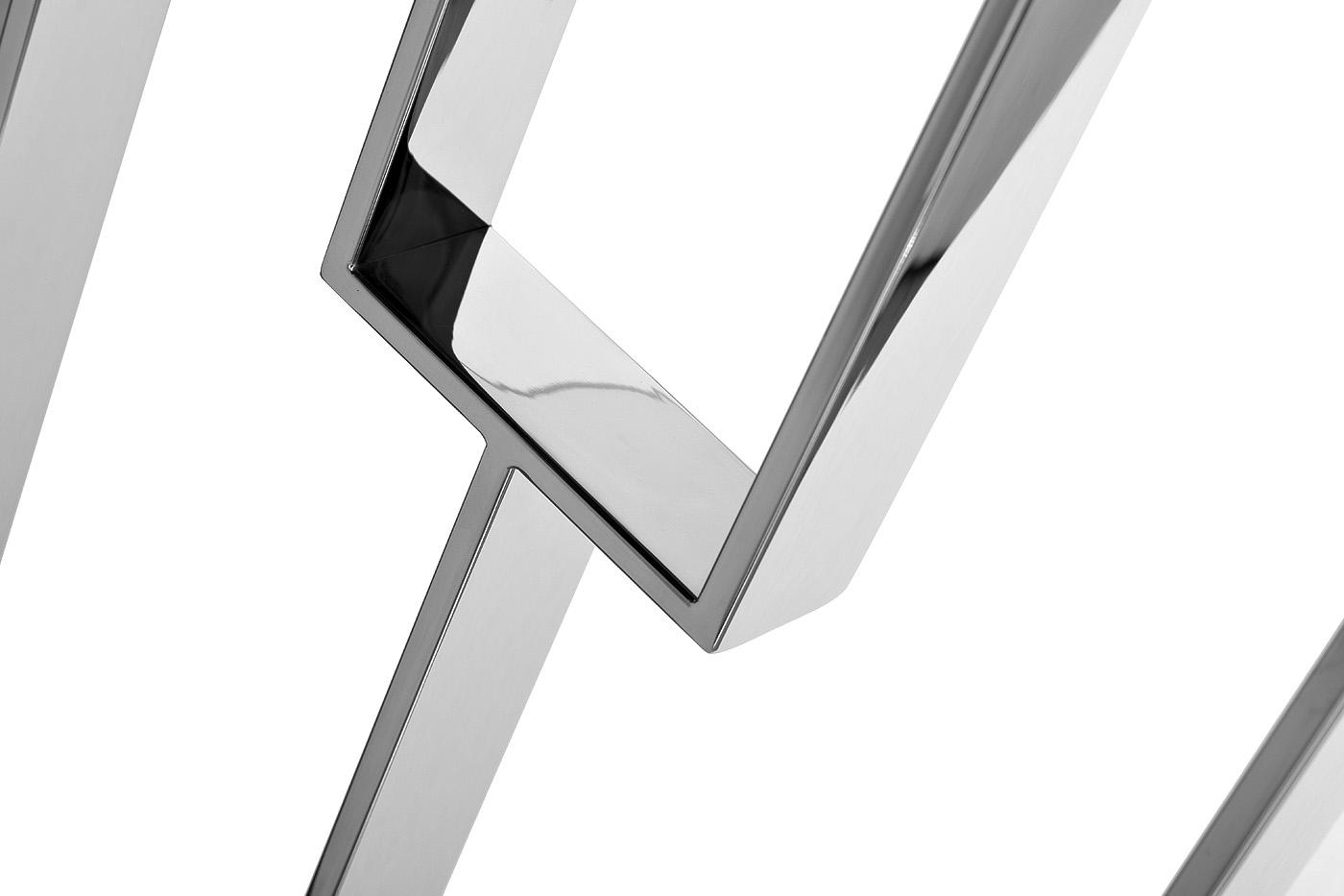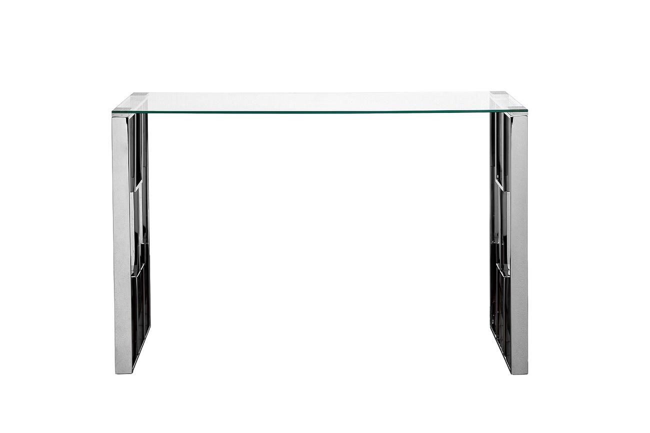 description-full - Дизайнерская консоль из стекла и хромированного металла – яркий пример мебели в стилистике ар-деко. Особенность данной модели – изящный каркас необычной формы из металла цвета хром. За счет такой основы и столешницы из прозрачного стекла консоль в гостиной будет смотреться стильно и элегантно. На ней уместно разместится разнообразный декор – статуэтки, шкатулки, подсвечники, вазы с цветами. В спальне консоль из стекла прекрасно справится с функцией туалетного столика, а в прихожей и коридоре она станет отличным местом для хранения ключей и аксессуаров. Толщина столешницы - 8мм.