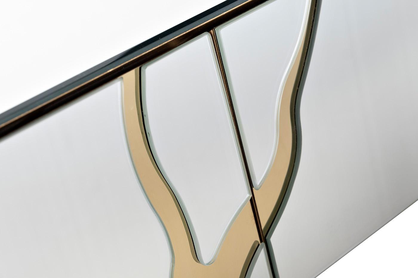 description-full - Дизайнерская зеркальная консоль идеально подойдет для роскошных интерьеров в стиле ар-деко. В ней есть все, что нужно, чтобы украсить жилое пространство и добавить ему нотку аристократичного шика. Изюминка мебели – золотой декор, который перекликается с позолоченным основанием из нержавеющей стали. За счет этого стильная консоль в гостиную выглядит роскошно и привносит в обстановку изысканности. Столешница из зеркала станет идеальным местом для размещения разнообразного декора – ваз, статуэток, подсвечников, шкатулок. Консоль с полками компактная, поэтому подойдет для размещения в прихожей, спальне, гостиной. Ее можно дополнить другой мебелью из данной коллекции.