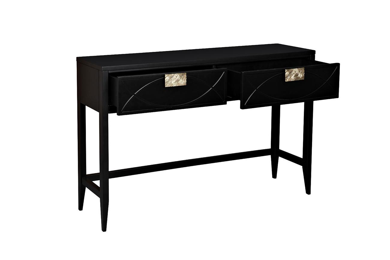 Дизайнерская консоль в стиле ар-деко - авторская разработка студии Garda Decor. Черный матовый фасад украшен объемным дугообразным декором и широкими рельефными ручками золотого цвета. Два выдвижных ящика прекрасно подойдут для хранения щеток, косметики и...