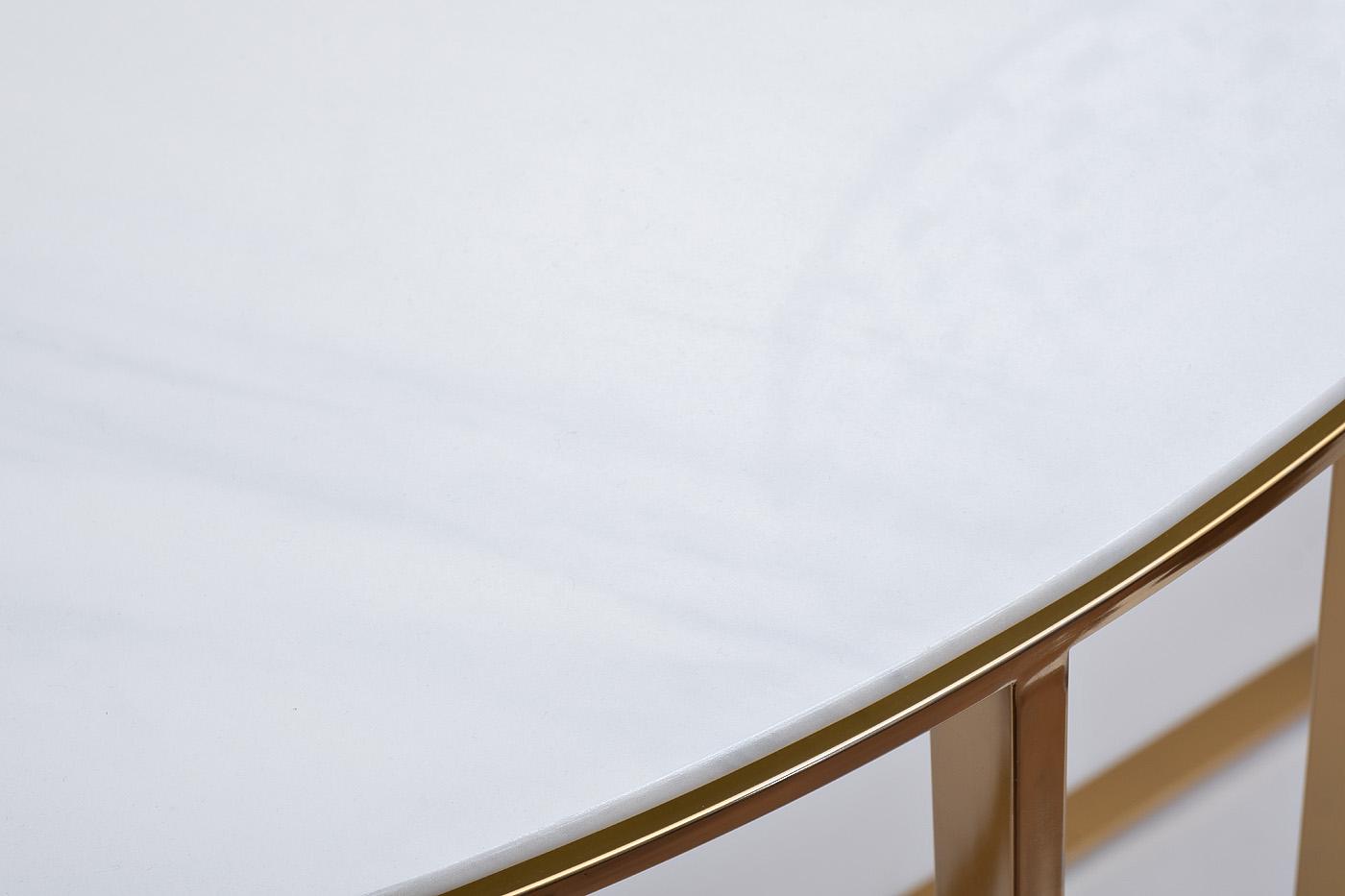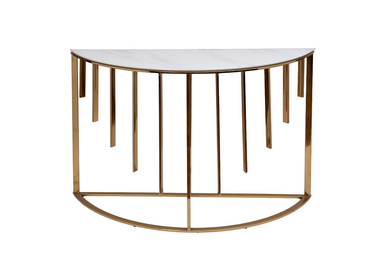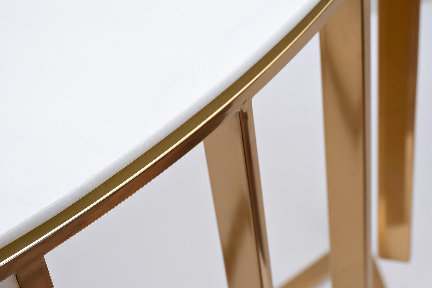 description-full - Дизайнерская приставная консоль отличается креативной формой и оформлением, в котором удачно сочетаются нержавеющая сталь и стеклянная столешница с эффектом мрамора. Модель изящная, легкая, элегантная, привносит в интерьер нотку аристократического шика. За счет тандема золота и мрамора консоль в гостиную выглядит весьма презентабельно и оригинально. Светлая столешница с имитацией под мрамор – отличное место для ваз, кашпо, статуэток, шкатулок и прочего декора. Благодаря компактным размерам консоль в стиле ар-деко подойдет для прихожей, спальни, прихожей. Это универсальная красивая мебель, которой везде найдется место.
