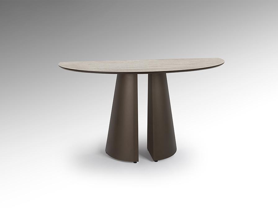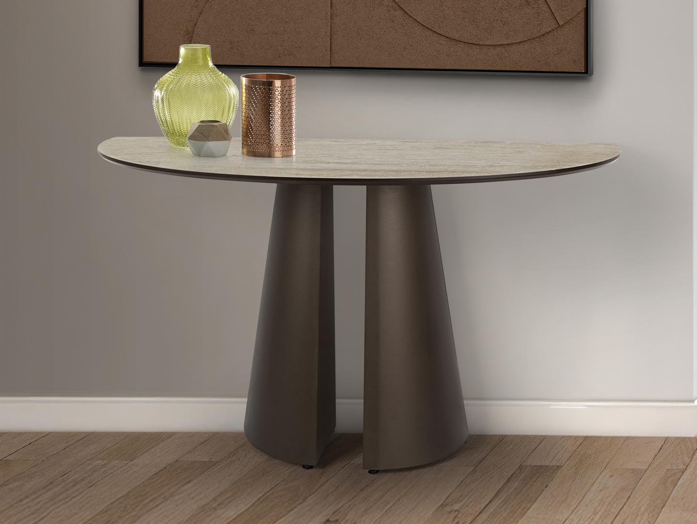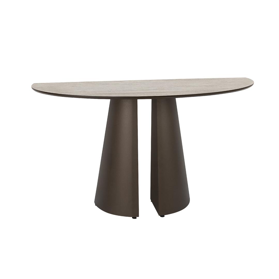 Консоль, каркас из металла и МДФ с оксидно-коричневой отделкой. Столешница из МДФ с высокопрочной меламиновой поверхностью, отделка под травертин, с оксидно-коричневыми краями.