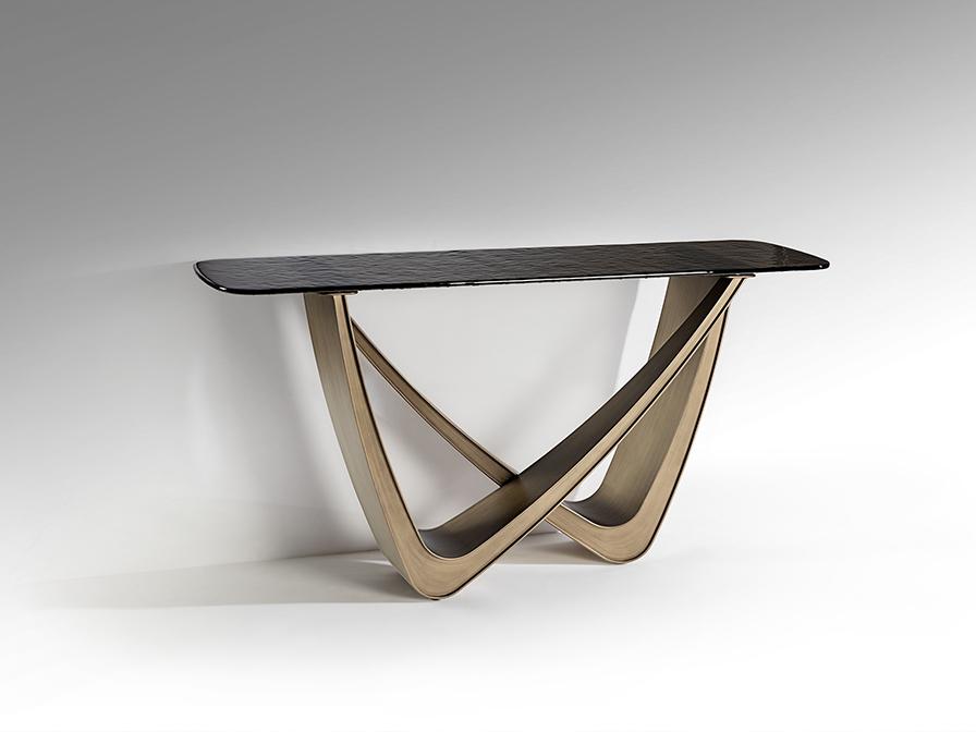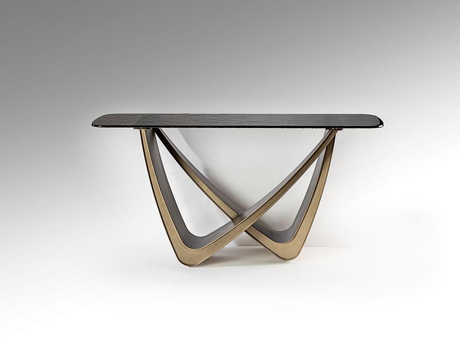 Консольный столик из металла с отделкой под состаренную бронзу. Столешница из серого термоформованного стекла с текстурированной поверхностью.