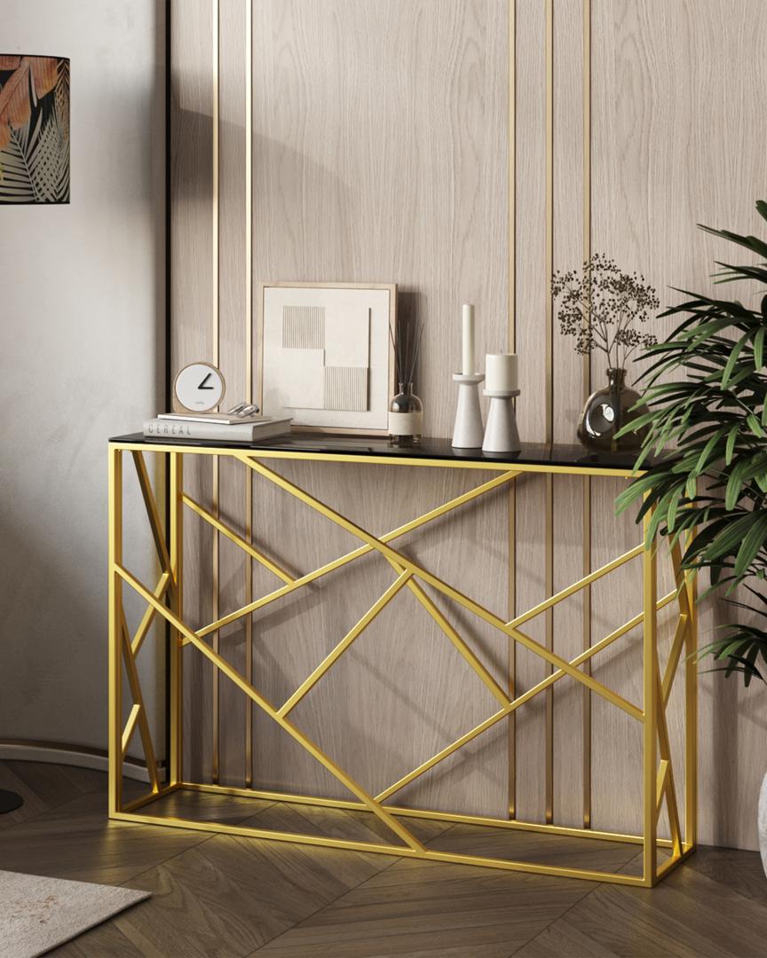 Консоль Арт Деко 115*30, стальной каркас золотого цвета, столешница стеклянная