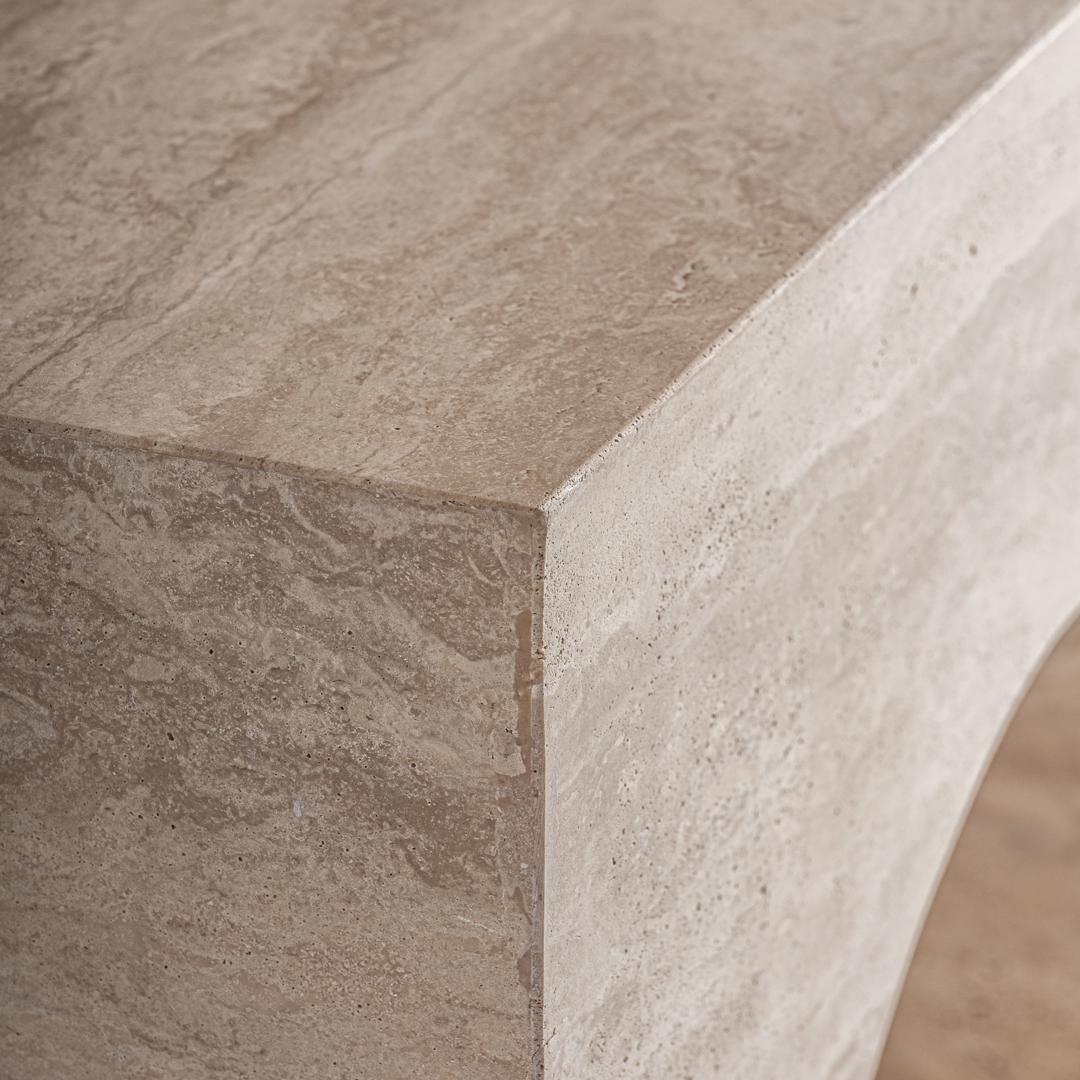 Консоль из травертина бежевого цвета. Консоль изготовлен(а) из натуральных материалов, поэтому каждый из них будет эксклюзивным, со своими уникальными оттенками и текстурами. Пористость и неоднородность материала не считаются браком Ширина: 150 см, Глубина: 35 см, Высота: 80 см
