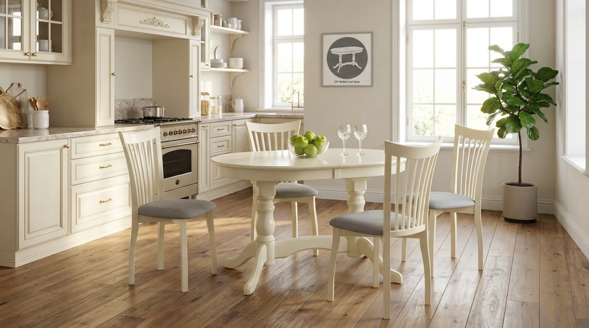 Комплект из деревянного стола Бизе на каркасе из натурального дерева и 4 стула Миранда отлично подойдет к интерьеру, выдержанному в классическом стиле. Данный комплект станет центральным элементом в гостиной, столовой зоне, на кухне, позволив создать уютное обеденное место, где смогут собираться члены дружной семьи и их гости.У модели овальная форма столешницы. Такое решение исключит риск сколов и обеспечит безопасность, в том числе, детям.Комплект выполнен в красивом цвете - слоновая кость. Сочетание изысканного дизайна и высокого качества исполнения - главная особенность комплекта.Столешница выполнена из материалов с великолепными эксплуатационными свойствами - МДФ (Материал создается на основе натуральной древесины. Практичен, надежен, имеет однородную гладкую структуру), шпон.Мебель проста в уходе - для поддержания первозданного вида достаточно использовать простую чуть влажную салфетку по мере необходимости.Состав комплекта:- стол F212020S00- стулья R001441S01
