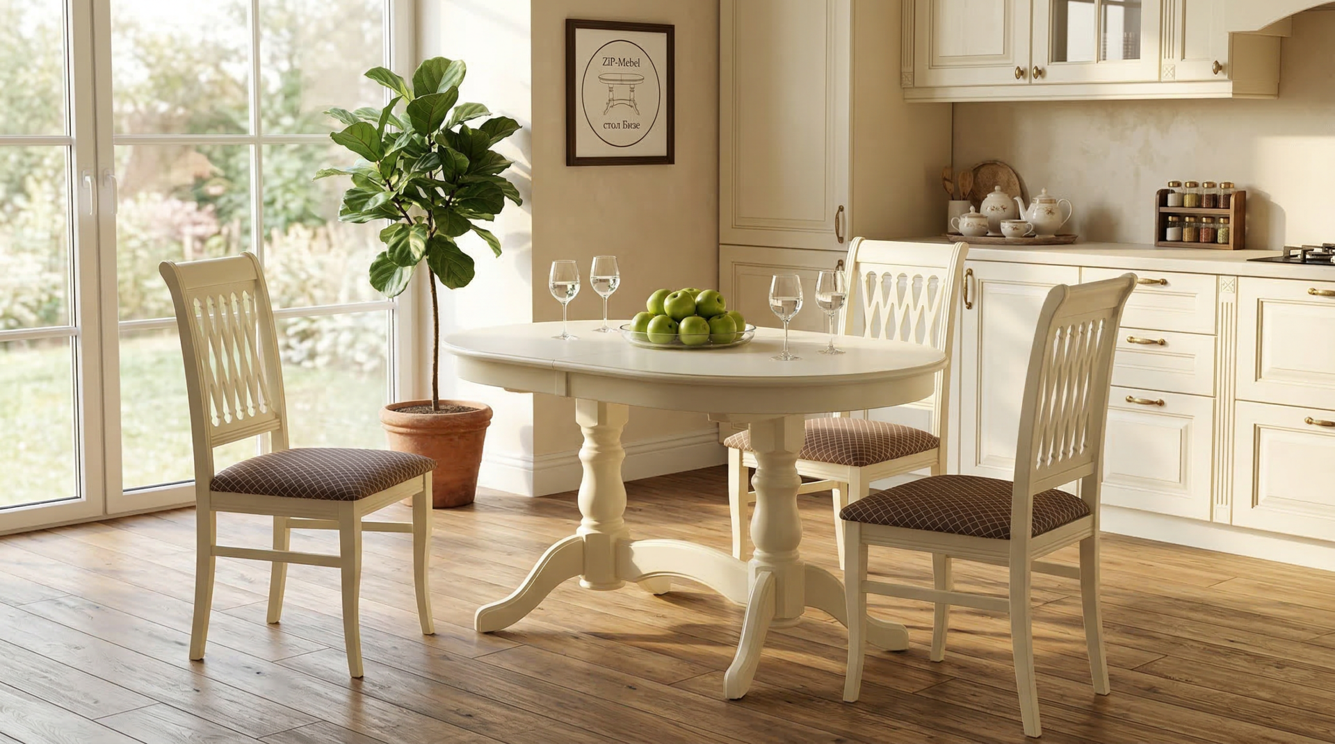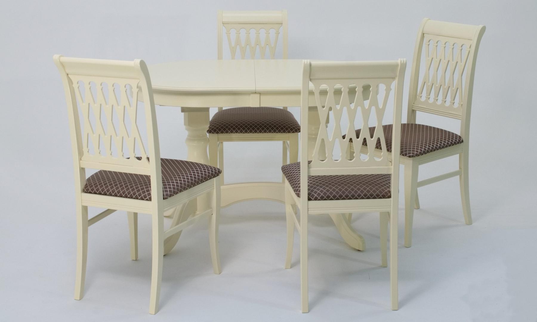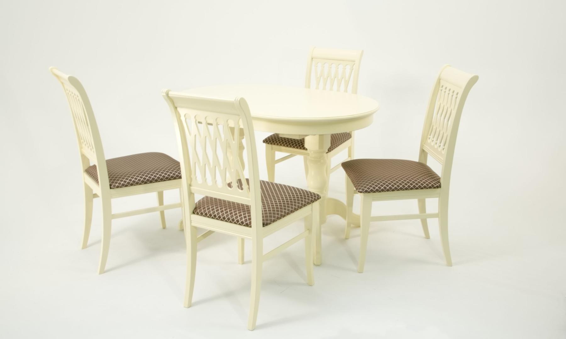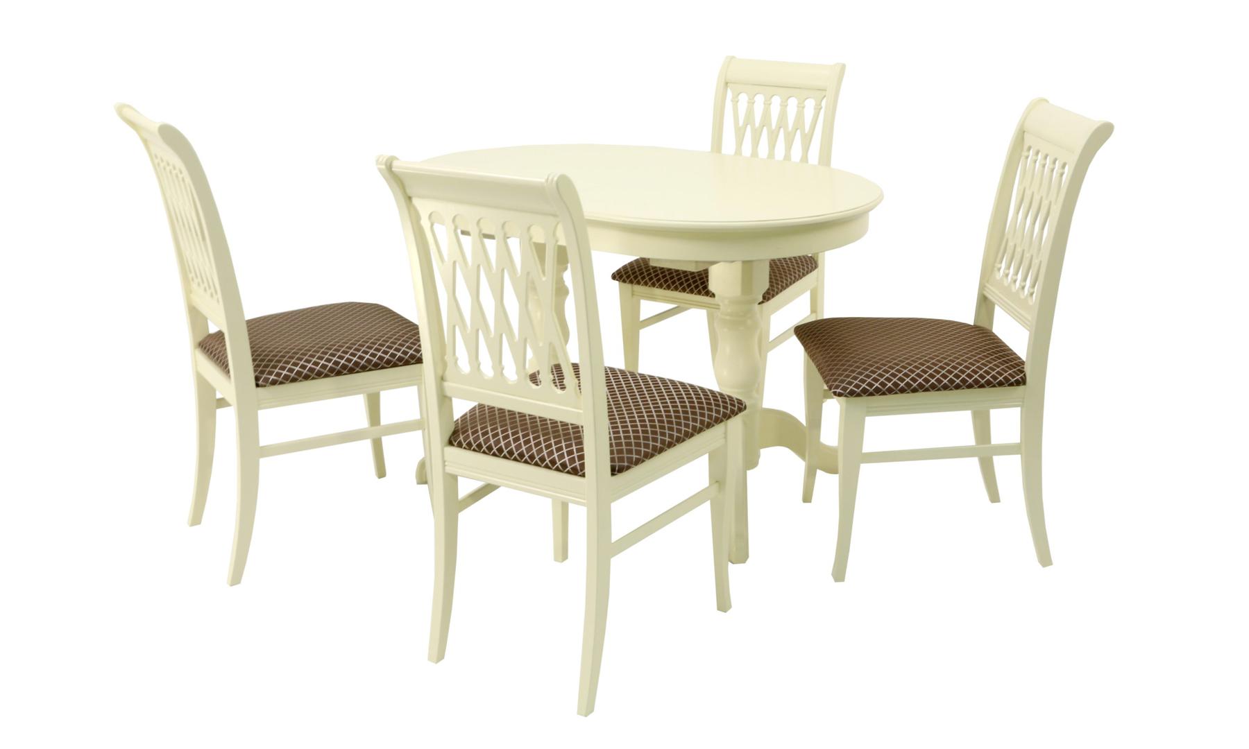 Комплект из деревянного стола Бизе на каркасе из натурального дерева и 4 стула Рич отлично подойдет к интерьеру, выдержанному в классическом стиле. Данный комплект станет центральным элементом в гостиной, столовой зоне, на кухне, позволив создать уютное обеденное место, где смогут собираться члены дружной семьи и их гости.У модели овальная форма столешницы. Такое решение исключит риск сколов и обеспечит безопасность, в том числе, детям.Комплект выполнен в красивом цвете - слоновая кость. Сочетание изысканного дизайна и высокого качества исполнения - главная особенность комплекта.Столешница выполнена из материалов с великолепными эксплуатационными свойствами - МДФ (Материал создается на основе натуральной древесины. Практичен, надежен, имеет однородную гладкую структуру), шпон.Мебель проста в уходе - для поддержания первозданного вида достаточно использовать простую чуть влажную салфетку по мере необходимости.Состав комплекта:- стол F212020S00- стулья R001405S14