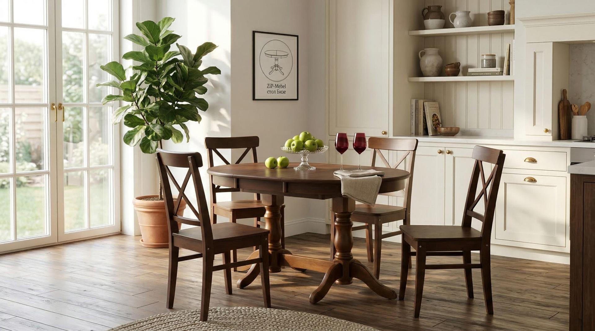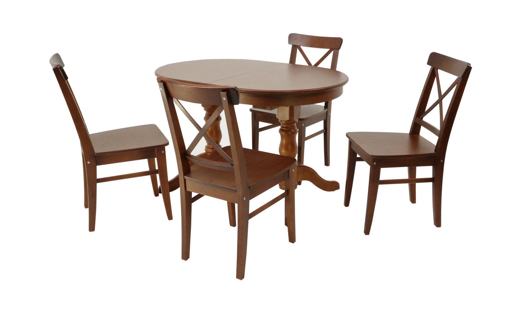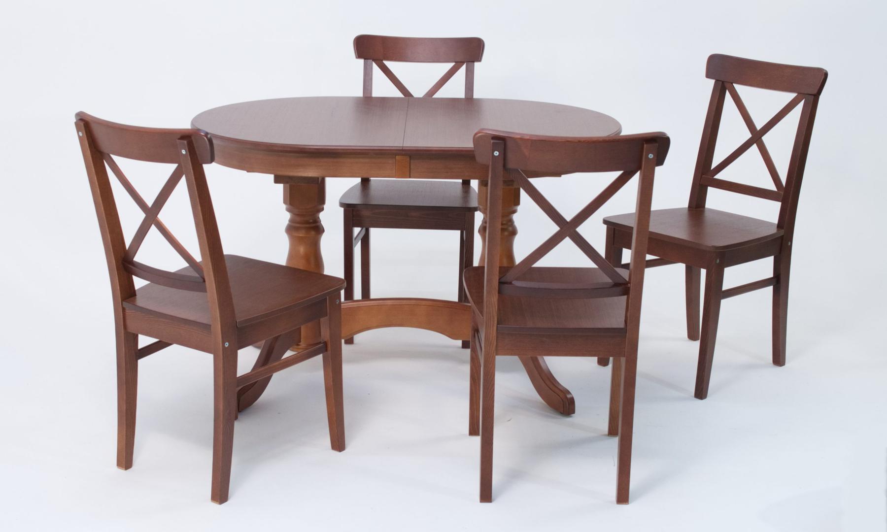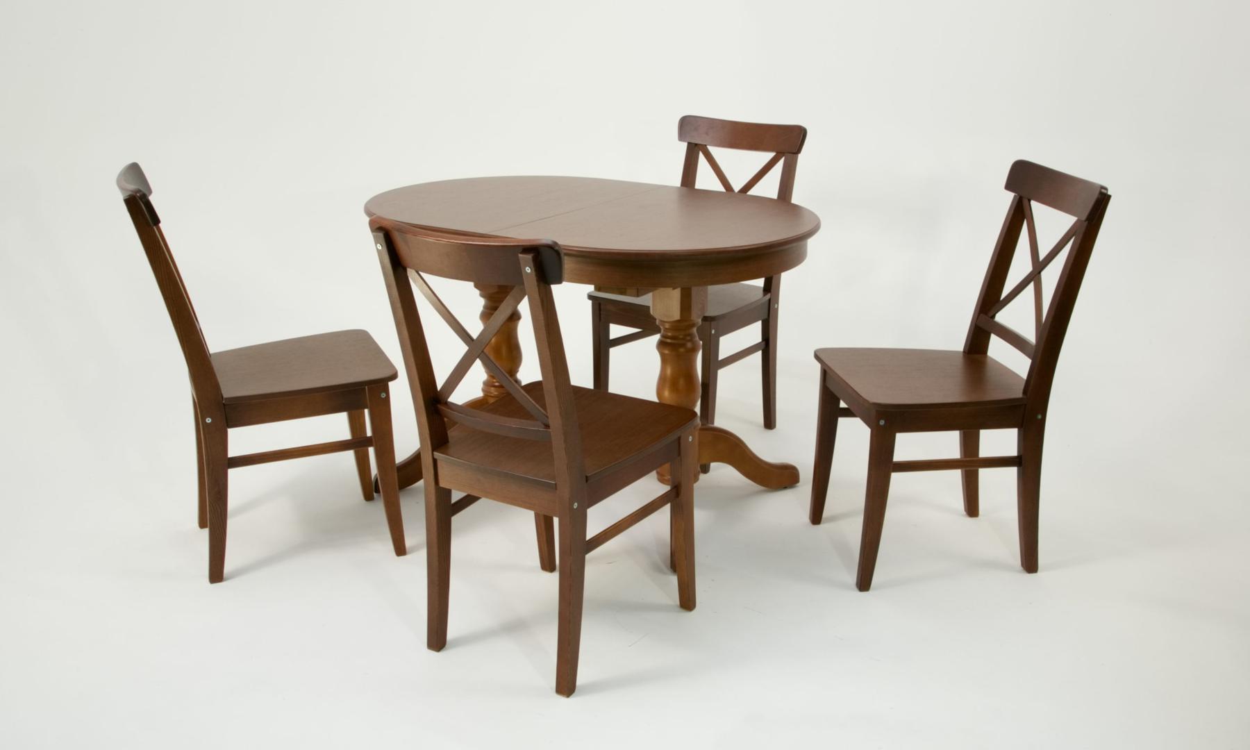 Комплект из деревянного стола Бизе на каркасе из натурального дерева и 4 стула Ингольф отлично подойдет к интерьеру, выдержанному в классическом стиле. Данный комплект станет центральным элементом в гостиной, столовой зоне, на кухне, позволив создать уютное обеденное место, где смогут собираться члены дружной семьи и их гости.У модели овальная форма столешницы. Такое решение исключит риск сколов и обеспечит безопасность, в том числе, детям.Комплект выполнен в красивом цвете - орех. Сочетание изысканного дизайна и высокого качества исполнения - главная особенность комплекта.Столешница выполнена из материалов с великолепными эксплуатационными свойствами - МДФ (Материал создается на основе натуральной древесины. Практичен, надежен, имеет однородную гладкую структуру), шпон.Мебель проста в уходе - для поддержания первозданного вида достаточно использовать простую чуть влажную салфетку по мере необходимости.Состав комплекта:- стол F212021W00- стулья R100742W00