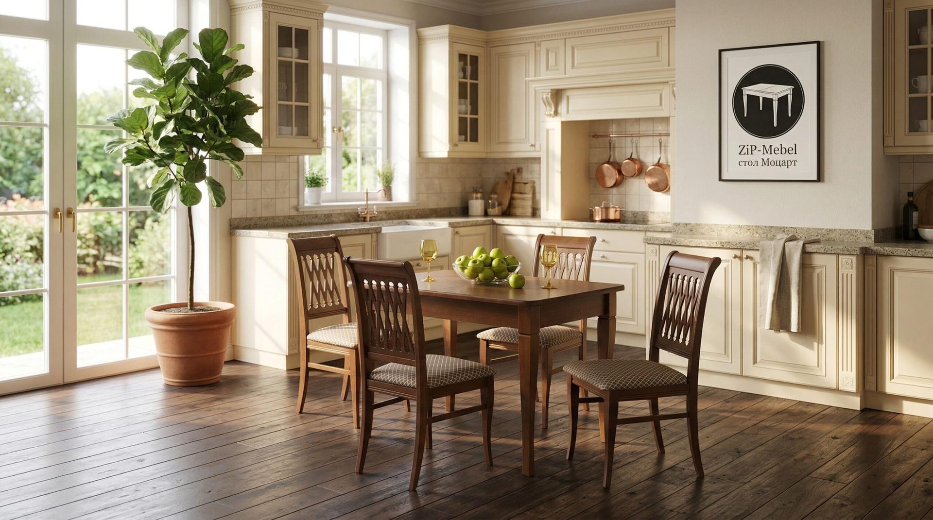 Комплект из деревянного стола Моцарт на каркасе из натурального дерева и 4 стульев Рич отлично подойдет к интерьеру, выдержанному в классическом или софременном стиле. Данный комплект станет центральным элементом в гостиной, столовой зоне, на кухне, позволив создать уютное обеденное место, где смогут собираться члены дружной семьи и их гости.У модели скругленные углы столешницы. Такое решение исключит риск сколов и обеспечит безопасность, в том числе, детям.Комплект выполнен в красивом цвете - орех. Сочетание изысканного дизайна и высокого качества исполнения - главная особенность комплекта.Столешница выполнена из материалов с великолепными эксплуатационными свойствами - МДФ (Материал создается на основе натуральной древесины. Практичен, надежен, имеет однородную гладкую структуру), шпон.Мебель проста в уходе - для поддержания первозданного вида достаточно использовать простую чуть влажную салфетку по мере необходимости.