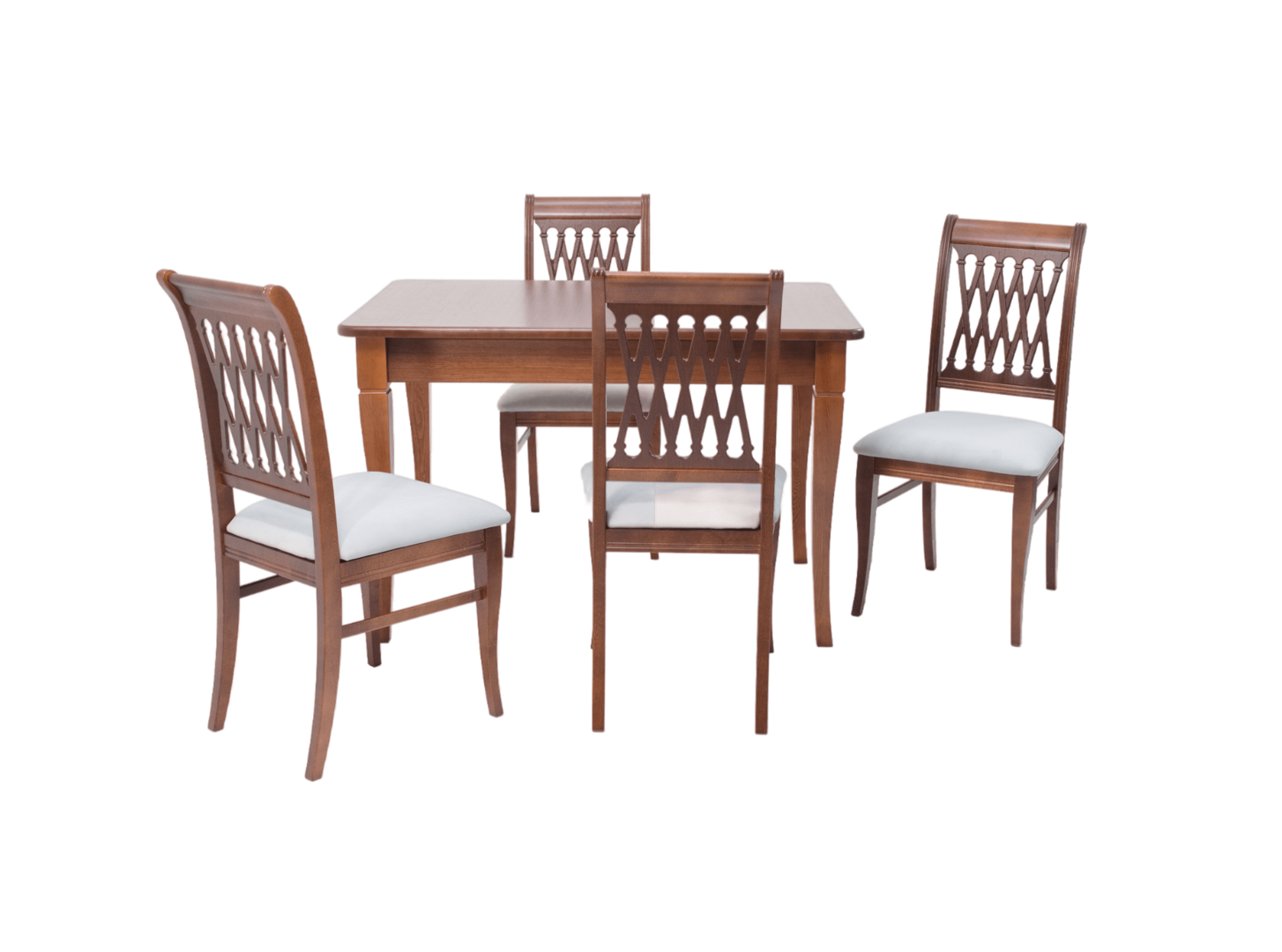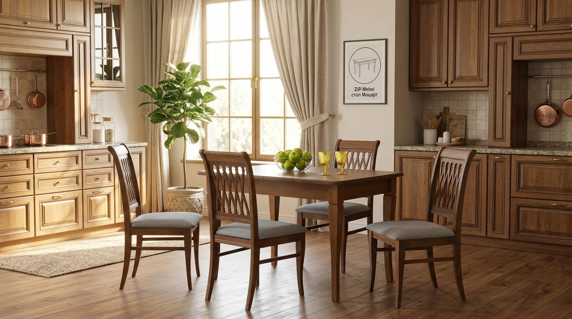 Комплект из деревянного стола Моцарт на каркасе из натурального дерева и 4 стульев Рич отлично подойдет к интерьеру, выдержанному в классическом или софременном стиле. Данный комплект станет центральным элементом в гостиной, столовой зоне, на кухне, позволив создать уютное обеденное место, где смогут собираться члены дружной семьи и их гости.У модели скругленные углы столешницы. Такое решение исключит риск сколов и обеспечит безопасность, в том числе, детям.Комплект выполнен в красивом цвете - орех. Сочетание изысканного дизайна и высокого качества исполнения - главная особенность комплекта.Столешница выполнена из материалов с великолепными эксплуатационными свойствами - МДФ (Материал создается на основе натуральной древесины. Практичен, надежен, имеет однородную гладкую структуру), шпон.Мебель проста в уходе - для поддержания первозданного вида достаточно использовать простую чуть влажную салфетку по мере необходимости.