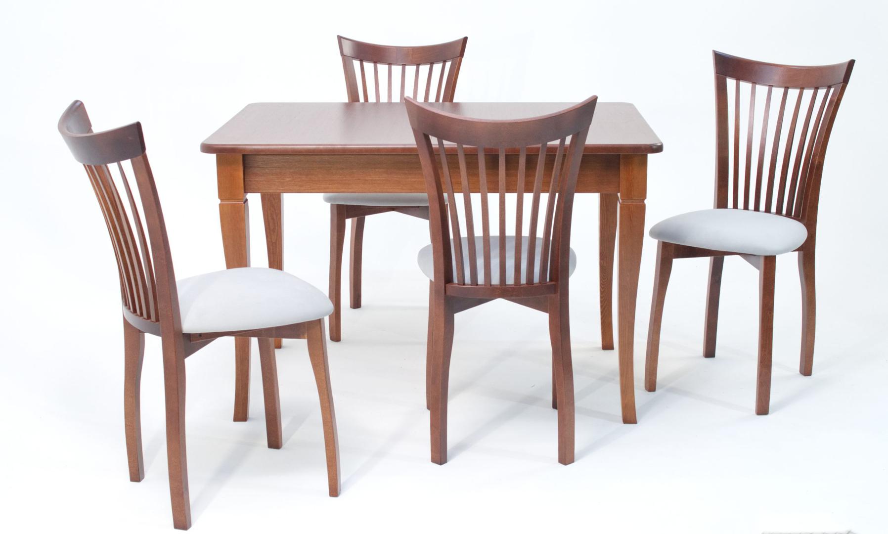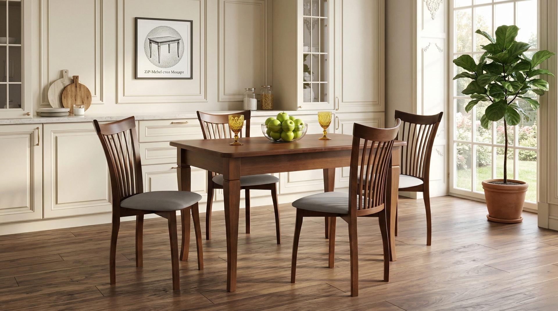 Комплект из деревянного стола Моцарт на каркасе из натурального дерева и 4 стульев Миранда отлично подойдет к интерьеру, выдержанному в классическом или софременном стиле. Данный комплект станет центральным элементом в гостиной, столовой зоне, на кухне, позволив создать уютное обеденное место, где смогут собираться члены дружной семьи и их гости.У модели скругленные углы столешницы. Такое решение исключит риск сколов и обеспечит безопасность, в том числе, детям.Комплект выполнен в красивом цвете - орех. Сочетание изысканного дизайна и высокого качества исполнения - главная особенность комплекта.Столешница выполнена из материалов с великолепными эксплуатационными свойствами - МДФ (Материал создается на основе натуральной древесины. Практичен, надежен, имеет однородную гладкую структуру), шпон.Мебель проста в уходе - для поддержания первозданного вида достаточно использовать простую чуть влажную салфетку по мере необходимости.