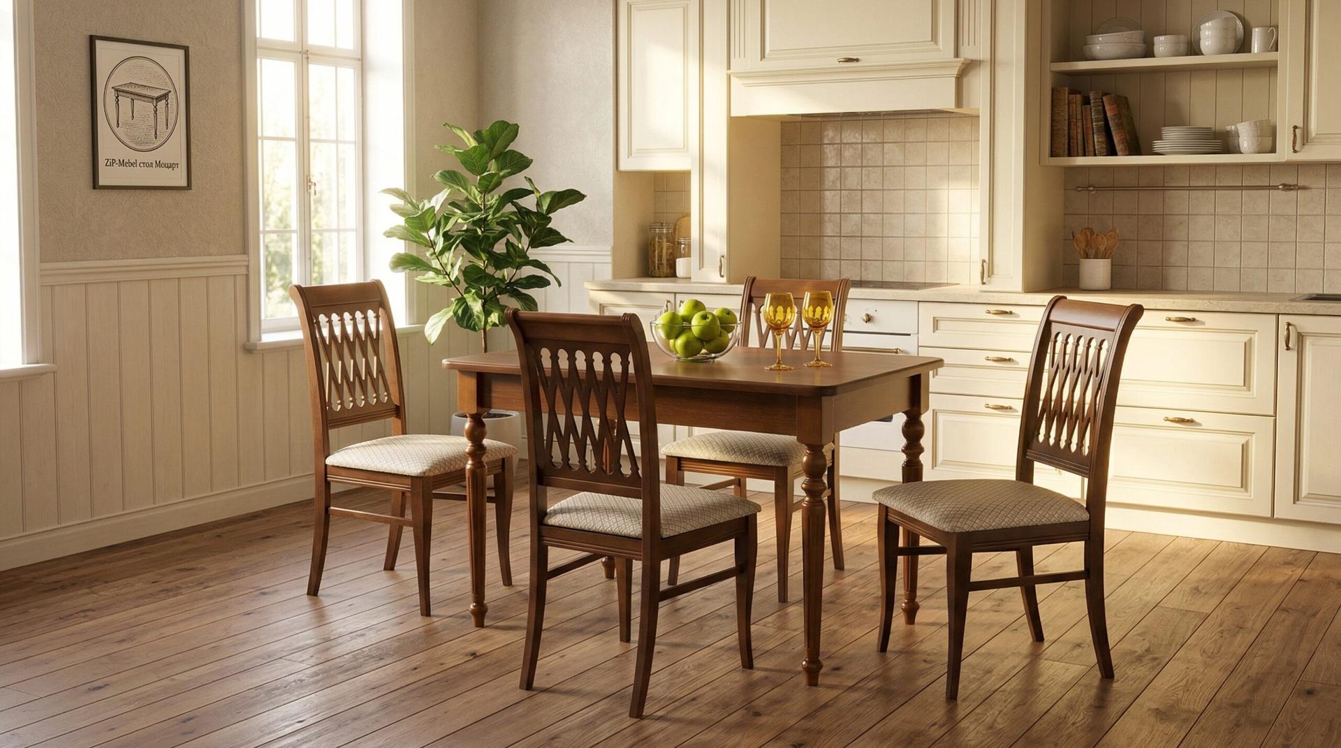 Комплект из деревянного стола Вивальди на каркасе из натурального дерева и 4 стульев Рич отлично подойдет к интерьеру, выдержанному в классическом или софременном стиле. Данный комплект станет центральным элементом в гостиной, столовой зоне, на кухне, позволив создать уютное обеденное место, где смогут собираться члены дружной семьи и их гости.У модели скругленные углы столешницы. Такое решение исключит риск сколов и обеспечит безопасность, в том числе, детям.Комплект выполнен в красивом цвете - орех. Сочетание изысканного дизайна и высокого качества исполнения - главная особенность комплекта.Столешница выполнена из материалов с великолепными эксплуатационными свойствами - МДФ (Материал создается на основе натуральной древесины. Практичен, надежен, имеет однородную гладкую структуру), шпон.Мебель проста в уходе - для поддержания первозданного вида достаточно использовать простую чуть влажную салфетку по мере необходимости.