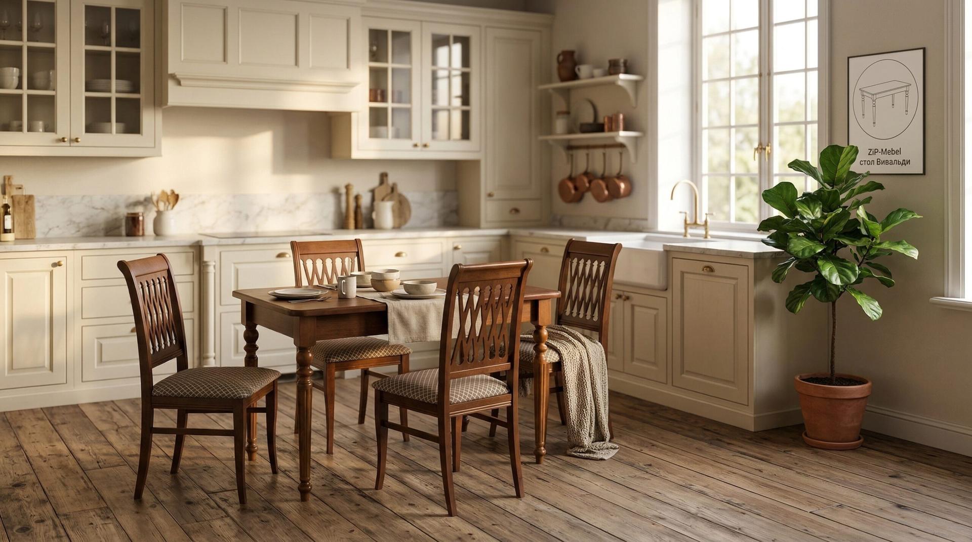 Комплект из деревянного стола Вивальди на каркасе из натурального дерева и 4 стульев Рич отлично подойдет к интерьеру, выдержанному в классическом или софременном стиле. Данный комплект станет центральным элементом в гостиной, столовой зоне, на кухне, позволив создать уютное обеденное место, где смогут собираться члены дружной семьи и их гости.У модели скругленные углы столешницы. Такое решение исключит риск сколов и обеспечит безопасность, в том числе, детям.Комплект выполнен в красивом цвете - орех. Сочетание изысканного дизайна и высокого качества исполнения - главная особенность комплекта.Столешница выполнена из материалов с великолепными эксплуатационными свойствами - МДФ (Материал создается на основе натуральной древесины. Практичен, надежен, имеет однородную гладкую структуру), шпон.Мебель проста в уходе - для поддержания первозданного вида достаточно использовать простую чуть влажную салфетку по мере необходимости.