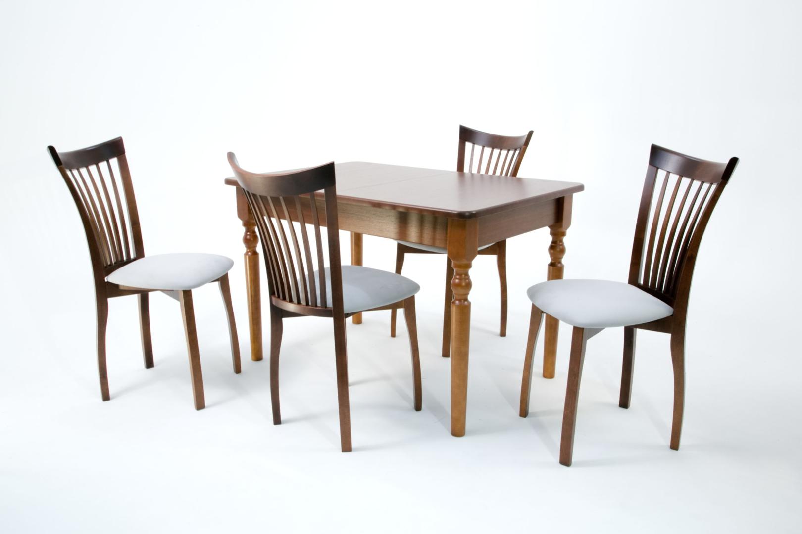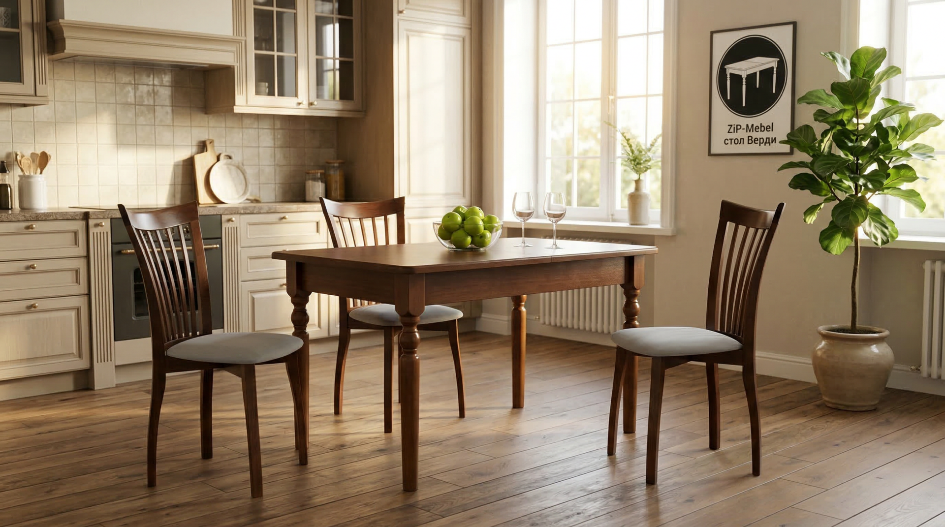 Комплект из деревянного стола Верди на каркасе из натурального дерева и 4 стульев Миранда отлично подойдет к интерьеру, выдержанному в классическом или софременном стиле. Данный комплект станет центральным элементом в гостиной, столовой зоне, на кухне, позволив создать уютное обеденное место, где смогут собираться члены дружной семьи и их гости.У модели скругленные углы столешницы. Такое решение исключит риск сколов и обеспечит безопасность, в том числе, детям.Комплект выполнен в красивом цвете - орех. Сочетание изысканного дизайна и высокого качества исполнения - главная особенность комплекта.Столешница выполнена из материалов с великолепными эксплуатационными свойствами - МДФ (Материал создается на основе натуральной древесины. Практичен, надежен, имеет однородную гладкую структуру), шпон.Мебель проста в уходе - для поддержания первозданного вида достаточно использовать простую чуть влажную салфетку по мере необходимости.