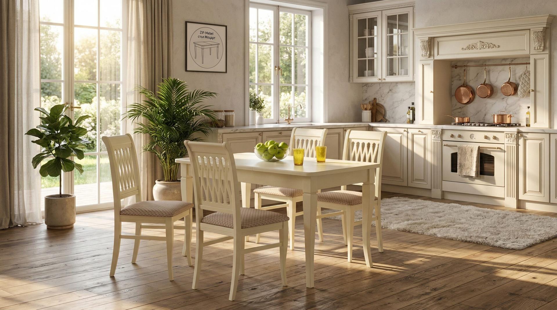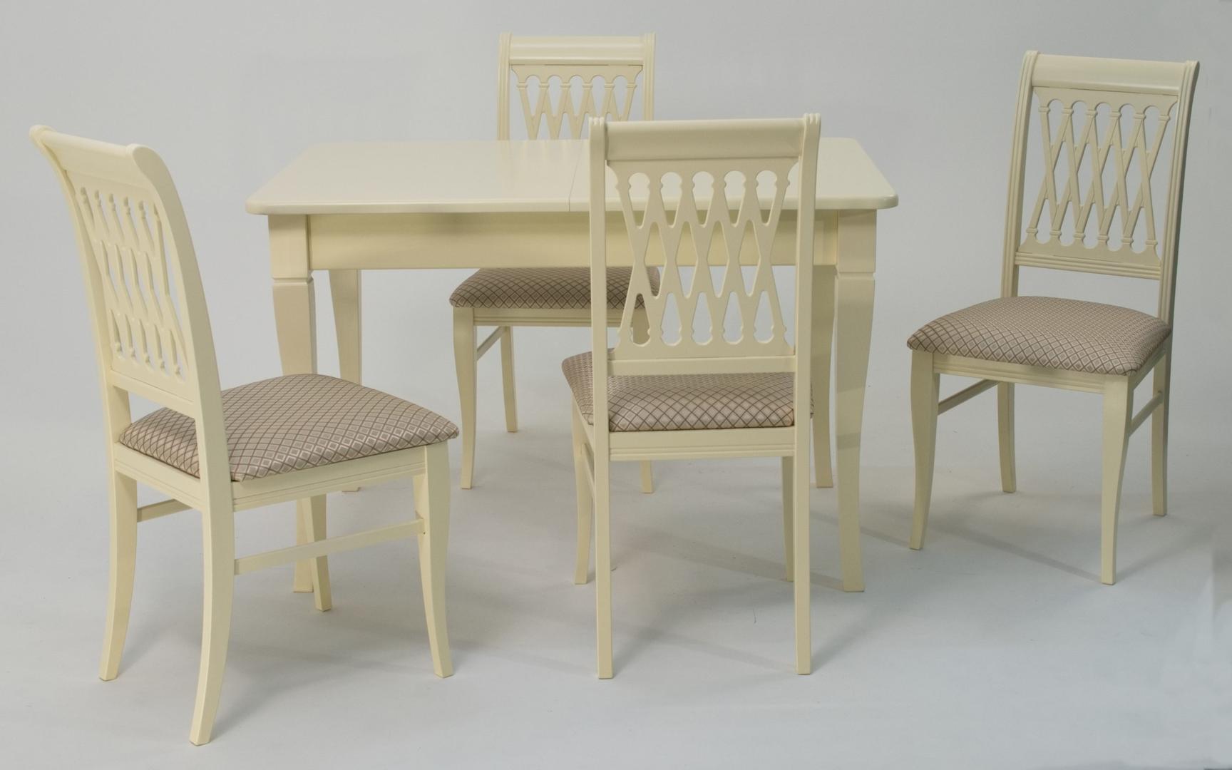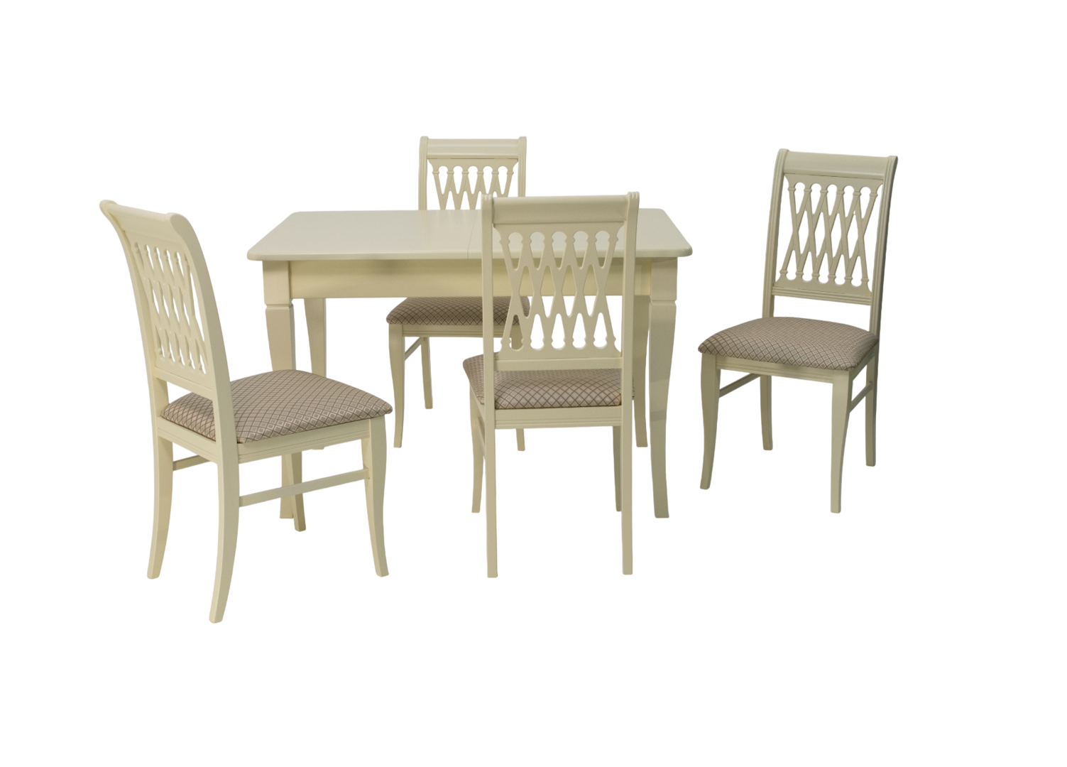 Комплект из деревянного стола Моцарт на каркасе из натурального дерева и 4 стульев Рич отлично подойдет к интерьеру, выдержанному в классическом или современном стиле. Данный комплект станет центральным элементом в гостиной, столовой зоне, на кухне, позволив создать уютное обеденное место, где смогут собираться члены дружной семьи и их гости.У модели скругленные углы столешницы. Такое решение исключит риск сколов и обеспечит безопасность, в том числе, детям.Комплект выполнен в красивом цвете - слоновая кость. Сочетание изысканного дизайна и высокого качества исполнения - главная особенность комплекта.Столешница выполнена из материалов с великолепными эксплуатационными свойствами - МДФ (Материал создается на основе натуральной древесины. Практичен, надежен, имеет однородную гладкую структуру), шпон.Мебель проста в уходе - для поддержания первозданного вида достаточно использовать простую чуть влажную салфетку по мере необходимости.