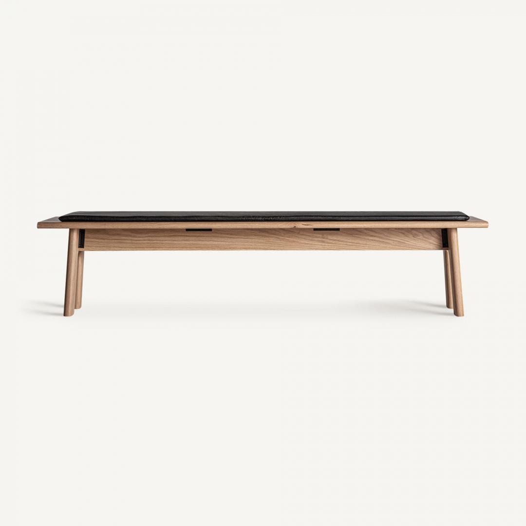 Скамья Nara в современном стиле, изготовлена из светло-коричневого дуба в сочетании с черной искусственной кожей.