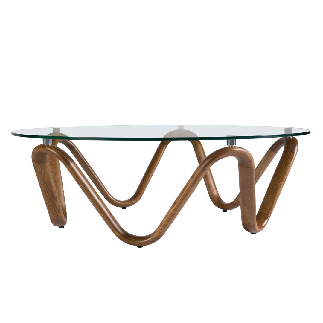 Круглый журнальный столик современного дизайна со столешницей из закаленного стекла и оригинальными деревянными ножками цвета орех.