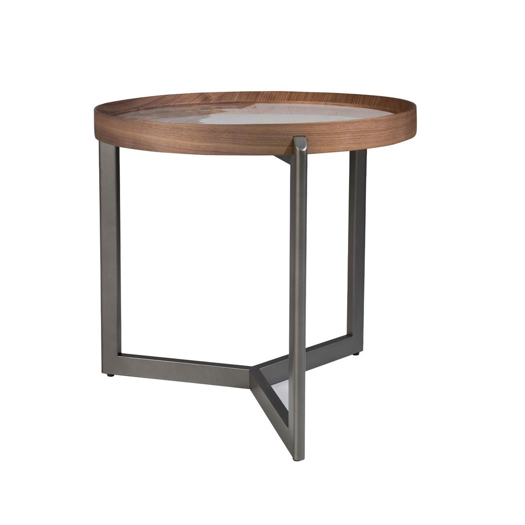 Круглый журнальный столик современного дизайна из натурального шпона ореха и элегантной столешницей из белого фарфора и мрамора с прожилками землистого тона с глянцевой отделкой. Его конструкция из темных металлических ножек из нержавеющей стали придает современный и авангардный вид, который вы ищете для своего дома.