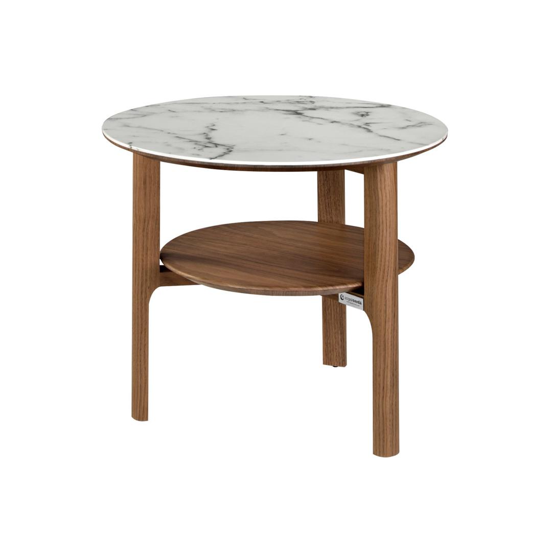 Угловой журнальный столик CP1806-I от фабрики Angel Cerda – изящное дополнение к современному интерьеру, в котором есть место смелым экспериментам. Угловой журнальный столик CP1806-I очаровывает с первого взгляда. Изюминка в его дизайне – это комбинация двух материалов. Совместить мраморную столешницу с ореховым деревом – смелый шаг, превращающий рядовое изделие в особенное. Столик сумеет украсить интерьер, в котором приветствуются нестандартные решения, где ценят естественную красоту природных материалов. Столик имеет круглую форму. Сверху деревянная столешница покрыта керамической панелью с имитацией под мрамор. Верхний слой – ударопрочное стекло, которое стойко переносит воздействие высоких температур и защищает керамический слой от сколов и повреждений. Удерживает столешницу опора, состоящая из трех ножек, равноудаленных от центра. Они сделаны из МДФ покрытого ореховым шпоном – прочной породы, гарантирующей стойкость к высоким весовым нагрузками. Техника их обработки напоминает ручной сруб, что придает колоритности изделию. Посередине ноги соединены тремя перекладинами, на которых находится полка. Она круглая, сделана из шпона орехового дерева. Масса столика составляет 13 кг, высота – 50 см. Изделие не требует сборки. В коллекцию CP1806 входят также тумба под ТВ, прикроватная тумбочка, комоды, прямоугольный журнальный столик. У всех изделий аналогичный дизайн.