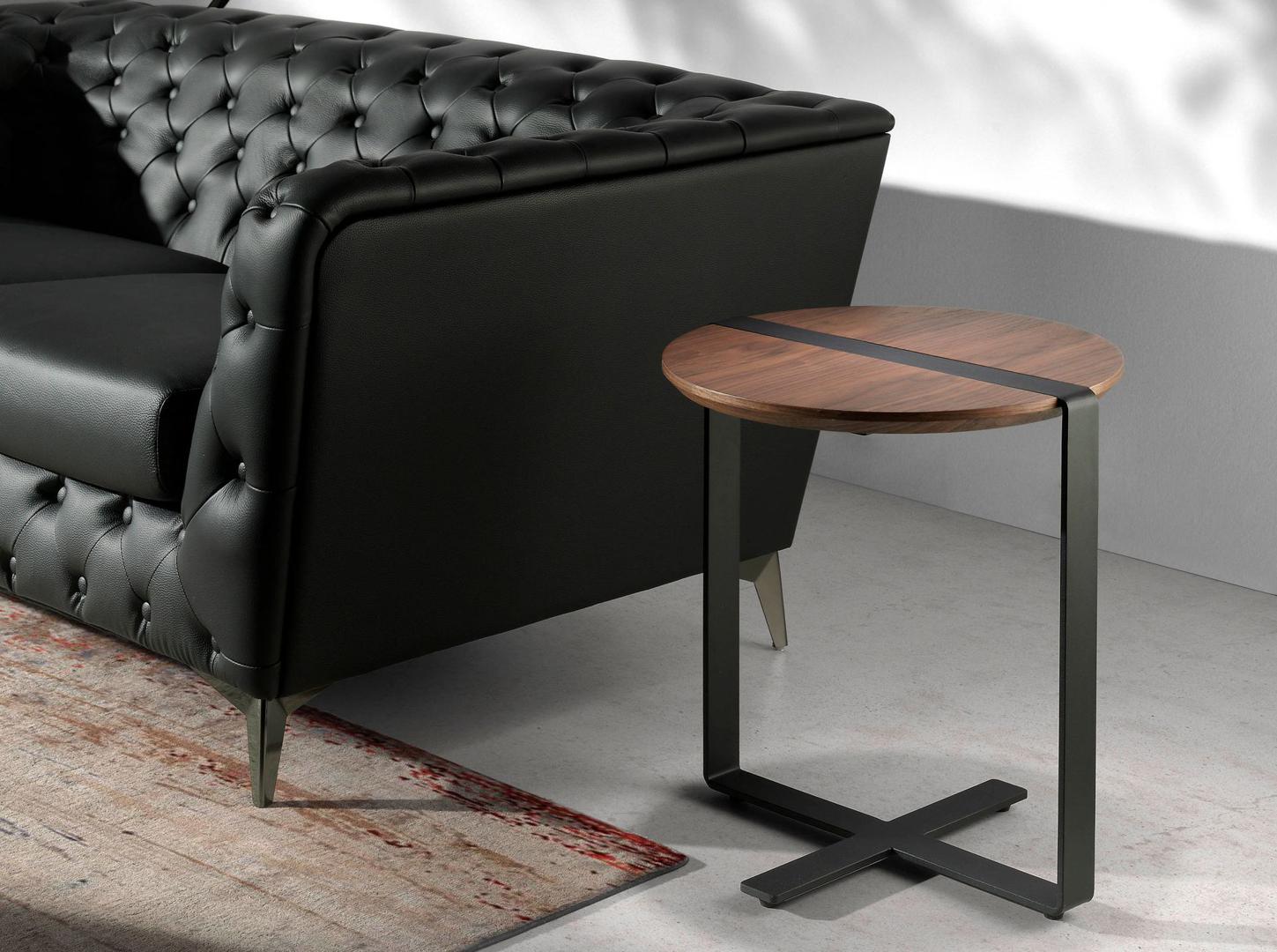 Журнальный столик MH1903B-NOGAL от фабрики Angel Cerda – незаурядный дизайн в минимализме. Журнальный столик MH1903B-NOGAL впечатлит каждого, кто является сторонником минимализма, но не скучного, а оригинального, сделанного со вкусом и дизайнерским подходом. В этой модели создателям удалось реализовать нестандартную конструкцию опоры, несмотря на скромные габариты. Изделие выглядит стильно и нестандартно, оно будет уместно в любой комнате. Столик выполнен из МДФ, шпона и металла. Круглая столешница имеет цвет орехового дерева (для базового фабричного варианта). Для защиты от негативных внешних воздействий, ее поверхность покрыта прозрачным лаком. Природный древесный рисунок служит естественным украшением для столешницы и хорошо сочетается с черной металлической опорой. Опора из металла, покрыта черной эпоксидной краской. Имея форму рамки, сверху она огибает столешницу, тем самым, визуально разделяя ее на две равные половины. Для устойчивости, внизу у опоры предусмотрена поперечная перекладина, которая, опираясь на пол, уравновешивает изделие, правильно распределяет нагрузку, придает устойчивость. Вес столика составляет 12 кг. Размеры: диаметр столешницы – 46 см, высота – 51 см. Потребуется небольшая сборка. Инструкция и крепеж входят в комплектацию.