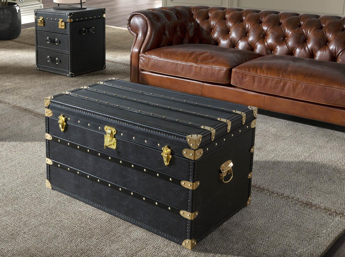 Современный дизайн чемодана с каркасом из МДФ, обитого черной воловьей кожей , с усиленными краями . Его золотистые крепления и заклепки придают нотку элегантности и индивидуальности, которую вы ищете в своем доме.
