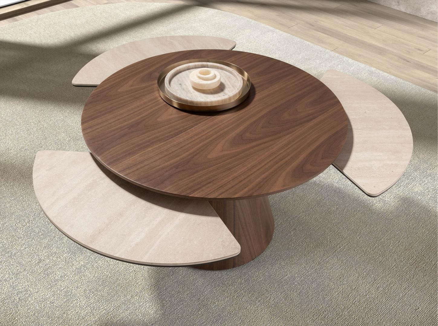 Круглый раздвижной журнальный столик в современном стиле со столешницей из натурального орехового шпона и песочного цвета из керамогранита с матовой отделкой, а также оригинальными ножками из натурального орехового шпона. Предмет мебели с простым, но оригинальным дизайном, который добавит неповторимый и индивидуальный штрих в ваш интерьер.