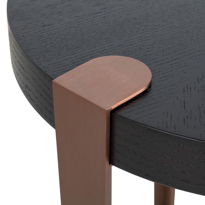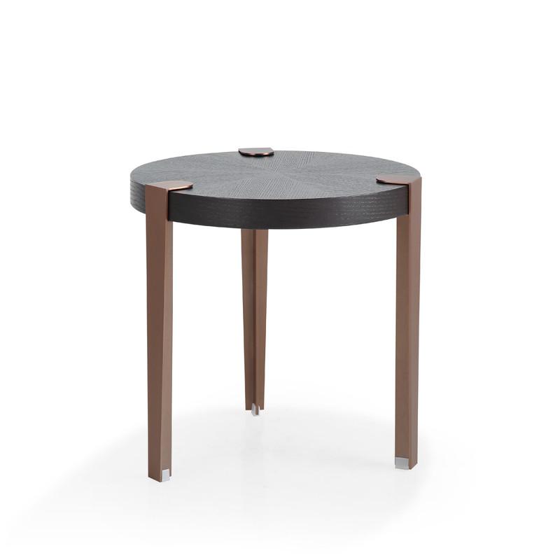 Приставной столик от итальянского бренда Fratelli Barri - элегантный и функциональный вариант для современной гостиной. Основание стола в цвете матовая бронза. Отделка столешницы - натуральный шпон дуба, тонированный в темный цвет.