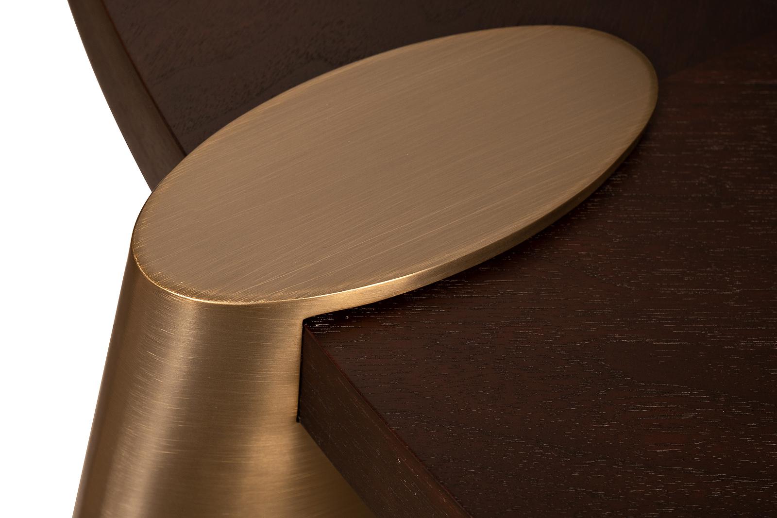 description-full - Журнальный стол Конг (Kong) в увеличенном диаметре — эффектный арт-объект для просторных современных интерьеров. Авторская работа бельгийского дизайнера Тома Де Вульфа вдохновлена эстетикой люксовых автомобилей: массивные латунные ножки с обтекаемой формой и шелковистым блеском металла подчеркивают брутальность и статус. Шпонированная столешница цвета тёмного ореха выполнена с ювелирной точностью, визуально собирая композицию к центру. Этот большой дизайнерский стол легко становится доминантой зоны отдыха в интерьере в стиле нео-лофт, нео-арт-деко или модерн. В нашем ассортименте вы можете подобрать так же другие журнальные столы этой серии Конг (Kong), но другого размера: арт. 58DB-19372, 58DB-CT17191