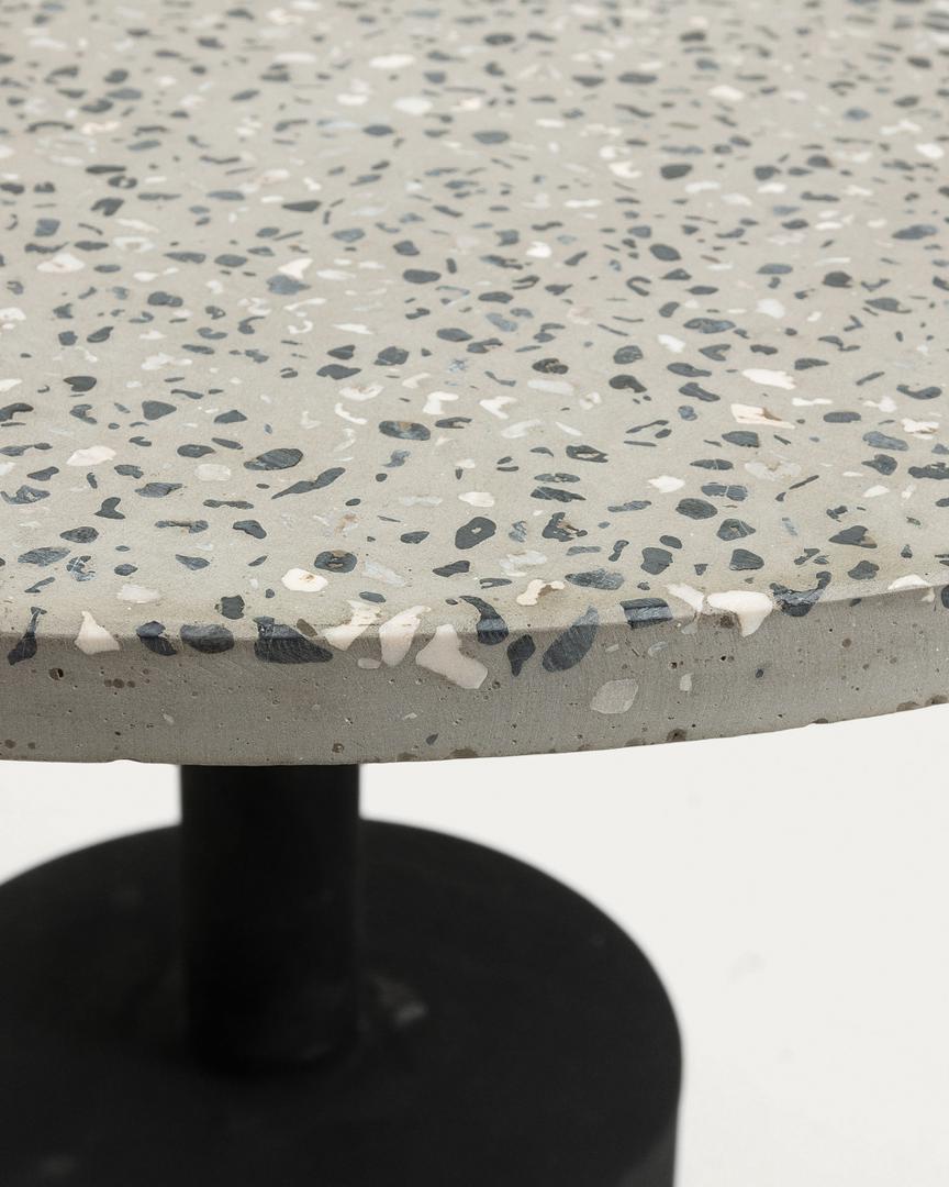 Столик приставной Melano от фабрики La Forma – практичный тераццо и гальванизированная стальная структура для использования дома и на улице. Приставной столик Melano – это несомненно не только эффектная модель по своему дизайну, но и универсальная в плане места применения. Благодаря влагостойким материалам, изделие можно поставить на террасу или в саду, чтобы провести чаепитие на открытом воздухе. Стол круглой формы. Столешница толщиной 2 см выполнена из терраццо. Эта современная разновидность камня не портится от влаги, отличается прочностью, простой в уходе. Опора выполнена из металла и окрашена в черный цвет матовой краской. Она состоит из ноги и основания цилиндрической формы шириной 30 см. Для устойчивости на неровной поверхности, снизу есть резиновая прокладка. Максимально допустимая нагрузка – 30 кг. Размеры: ширина – 55 см, высота – 40 см. Вес – 23 кг. Потребуется небольшая самостоятельная сборка.