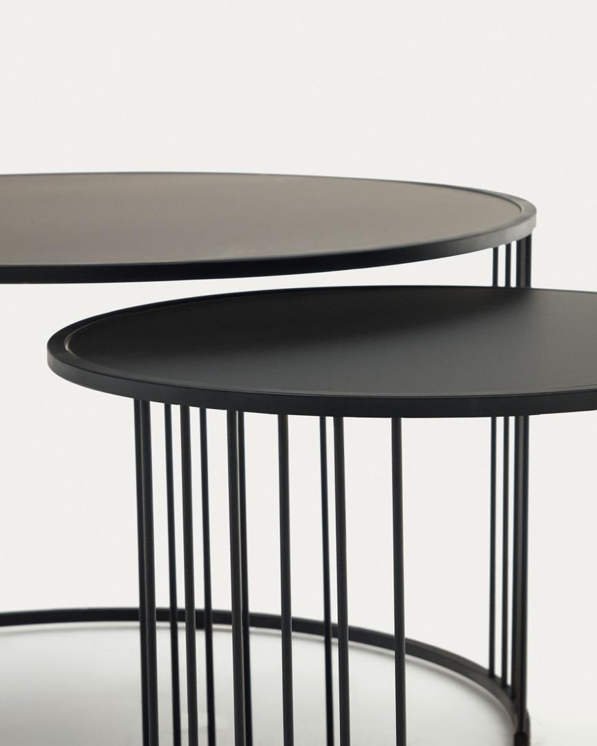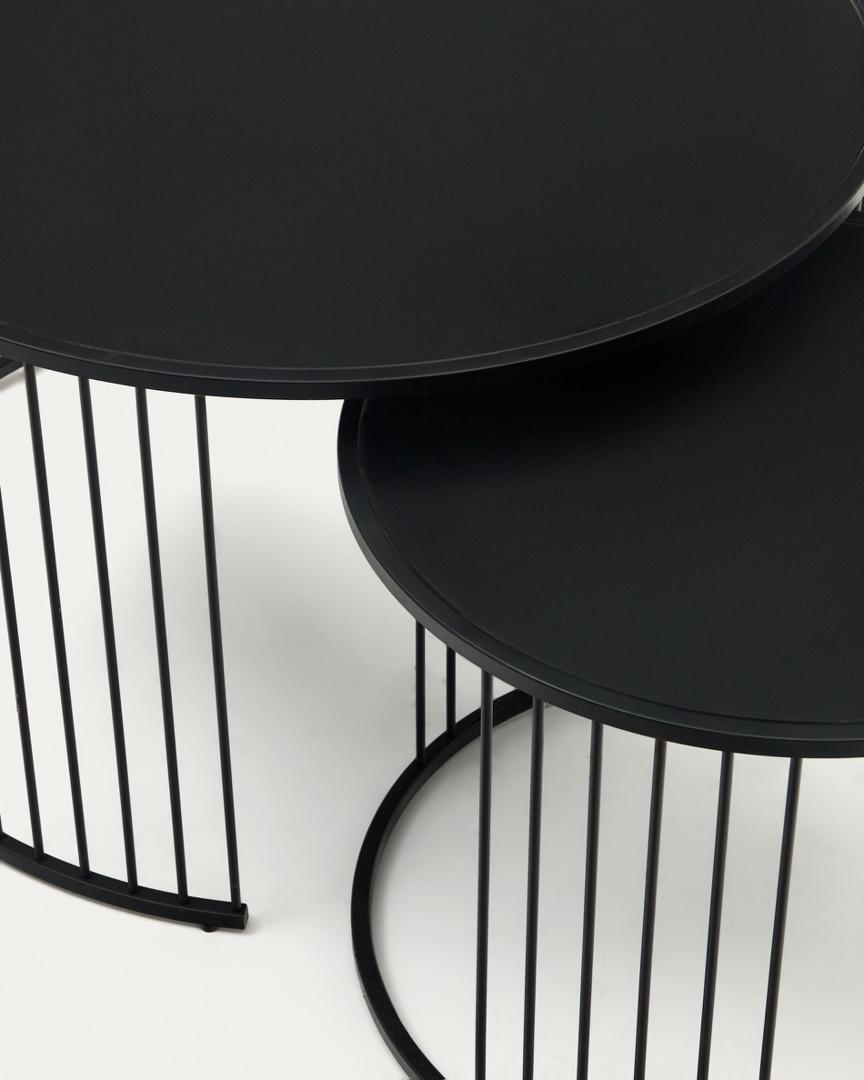 Комплект приставных столиков Hadar от фабрики La Forma (ex Julia Grup) – промышленный дизайн с двойной пользой. Столики Hadar – прекрасная возможность разнообразить обстановку с пользой. Промышленный минимализм, как основа в дизайне изделий, добавит пространству стиль и современный городской шик. А металл, как материал изготовления, будет вам гарантией в долговечности изделий. Встречайте свою промышленную эстетику! Столики круглые, состоят из металлического каркаса и стеклянной столешницы. Столешница имеет толщину 5 см. Она матового черного цвета, противоударная. Края обработаны от порезов. Столешница помещена в обруч высотой 1,4 см. Основание сделано из стали с черным матовым покрытием. Краска защищает металл от коррозии, иных негативных внешних воздействий. Стержни, соединяющие обруч-опору со столешницей, имеют диаметр 6 мм. Для устойчивости, на нижнем обруче есть специальные накладки. Размеры: диаметр – 75/50 см, высота – 45/40 см. Вес изделий – 13,5 кг. Столики предназначены только для эксплуатации в помещении
