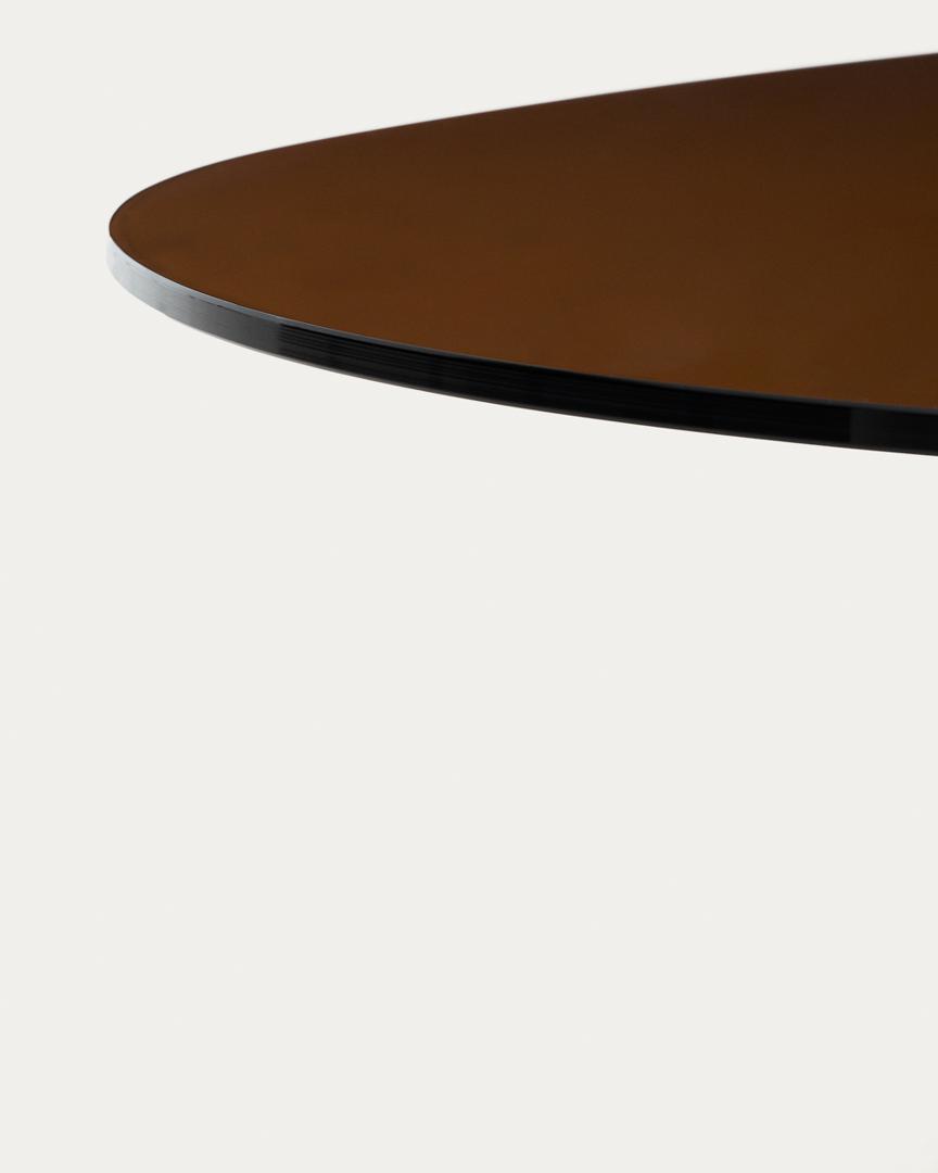 Стол Olir сочетает в себе стальное основание с глянцевой отделкой и столешницу из тонированного закаленного стекла, создавая изделие с органичными линиями. Скульптурная форма основания придает изделию характер и устойчивость, а стекло смягчает общий вид и пропускает свет, создавая ощущение легкости. Стальное основание покрыто порошковой краской, которая защищает поверхность от ударов, царапин и износа. Столешница из тонированного закаленного стекла обеспечивает равномерное распределение цвета и однородную отделку.