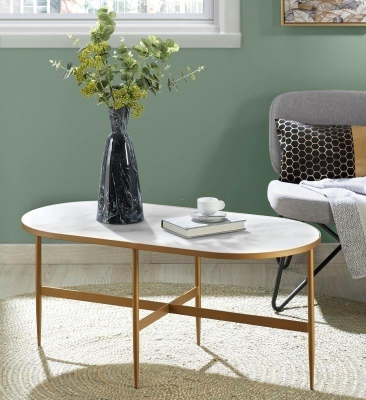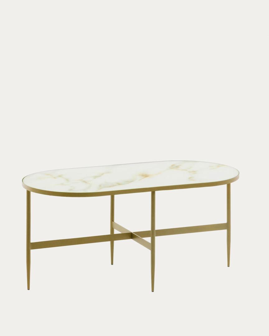 Столик Elisenda овальный от фабрики La Forma – мраморный рисунок с глянцевым лоском. Столик Elisenda – это воплощение стиля и свежей дизайнерской идеи. Главная особенность модели – столешница, выполненная из закаленного стекла с имитацией мрамора. Столик подойдет под любой современный интерьер, в котором новые фактуры будут не лишними. Журнальный стол овальной формы. Столешница толщиной 2 см окантована металлическим обручем, от которого отходит четыре ножки. Опора полностью покрыта позолотой, выполнена из стали. Ножки оснащены наконечниками для защиты напольного покрытия от повреждений. Они трубчатые, заужены к низу. Для прочности конструкции ножки попарно соединены реечными перекладинами с шириной грани 3 см. Благодаря равномерному распределению нагрузки и прочности металла, стол способен выдерживать вес до 25 кг. Размеры: длина – 100 см, глубина – 50 см, высота – 45 см. диаметр – 50 см, высота – 49 см. Вес – 11 кг. Потребуется небольшая самостоятельная сборка. В коллекцию Elisenda также входят консоль и приставной круглый столик, выполненные в том же дизайне.
