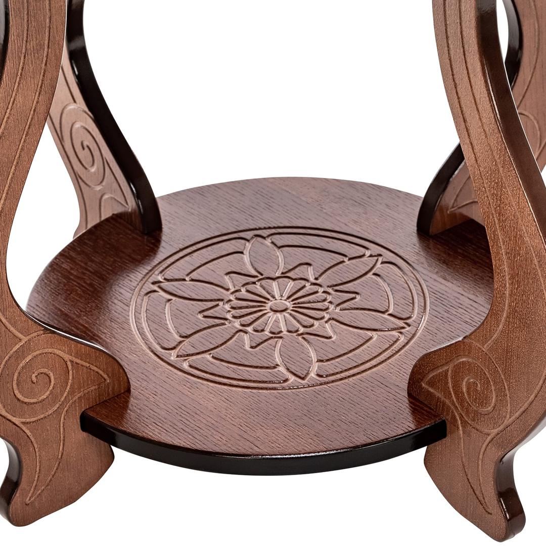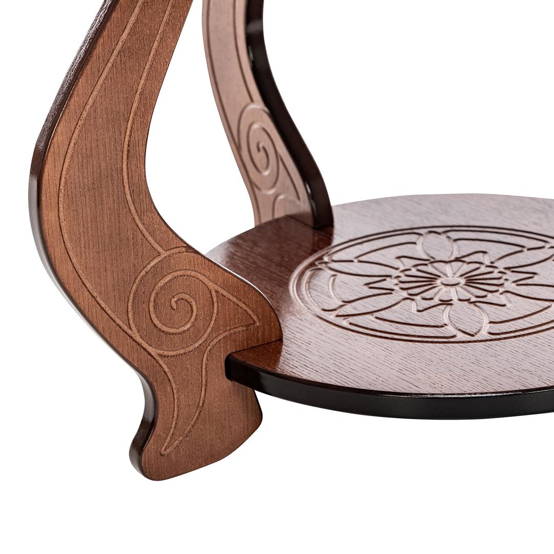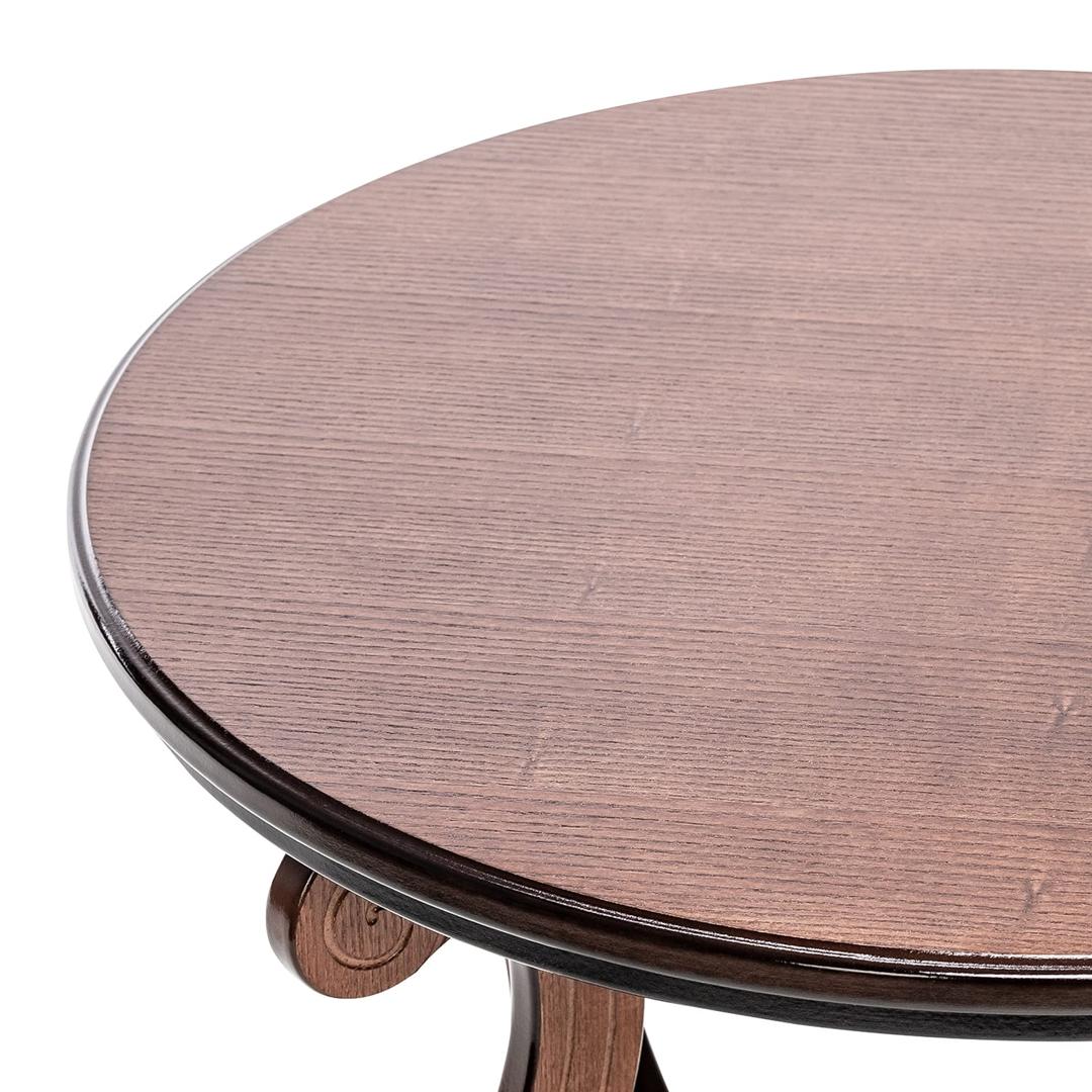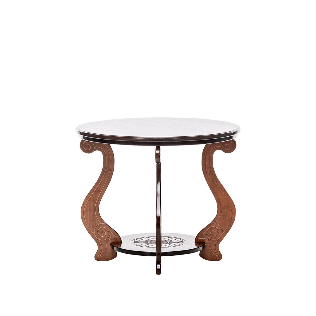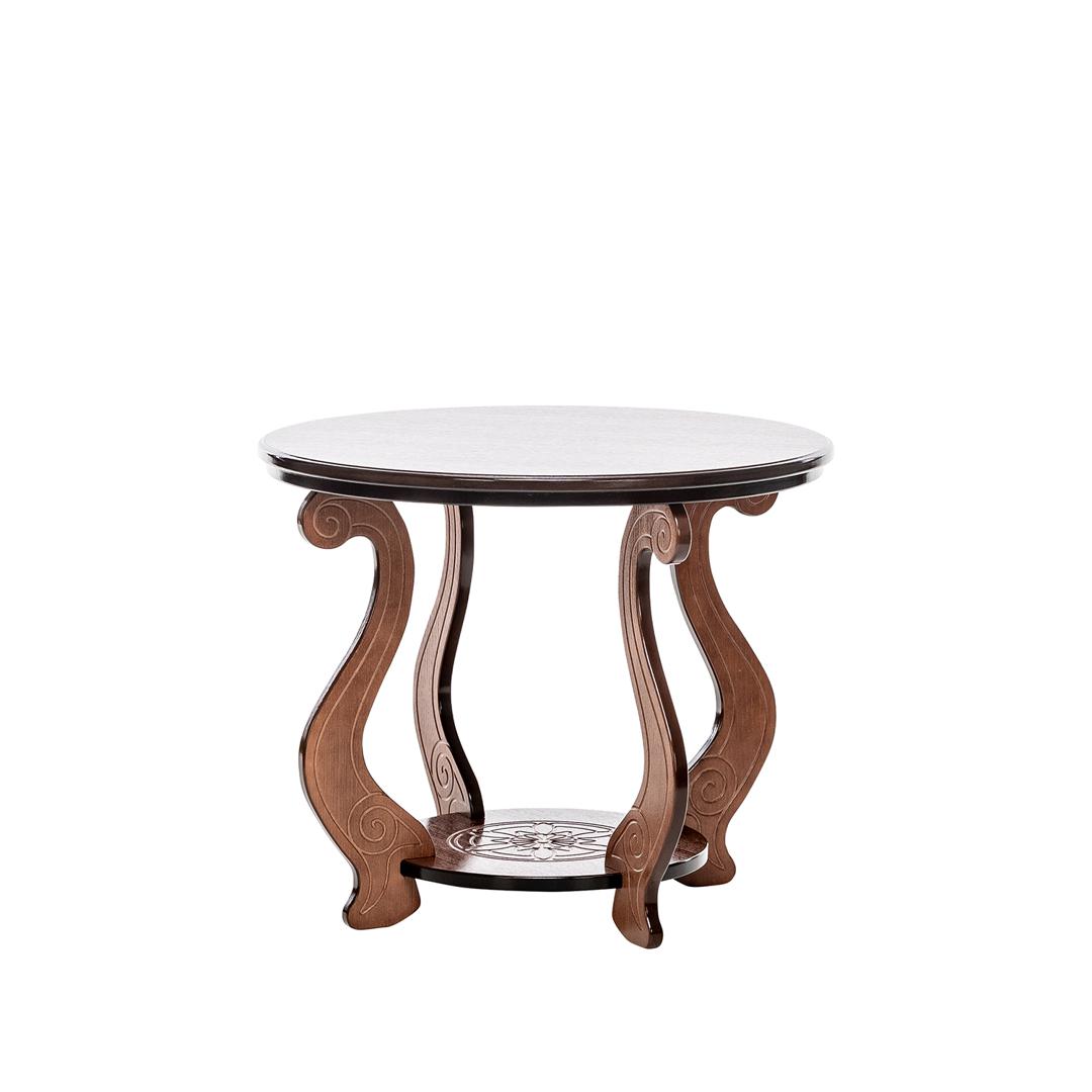 Круглый изящный столик с удобной полочкой. Форма ножек стола придает ему воздушность. Высококачественный МДФ и отделочный шпон различных цветов делают столик надежным и очень долговечным.
