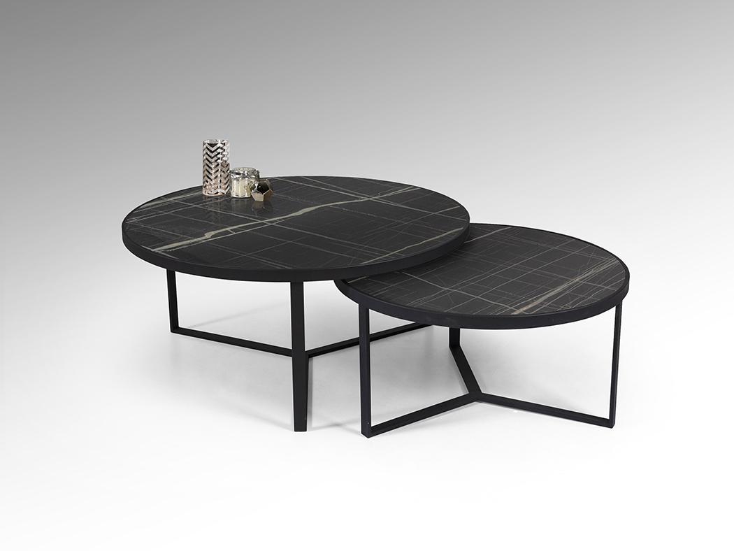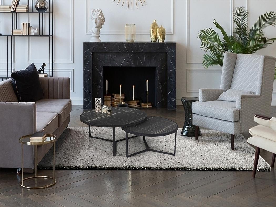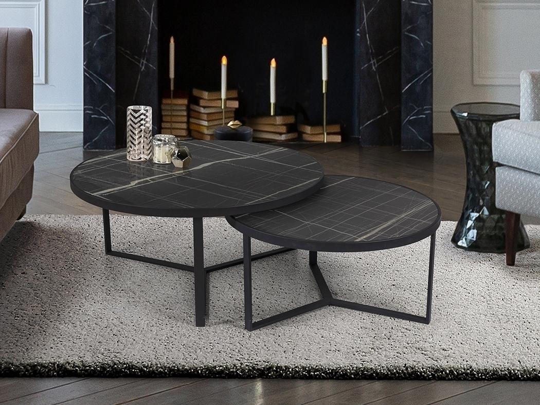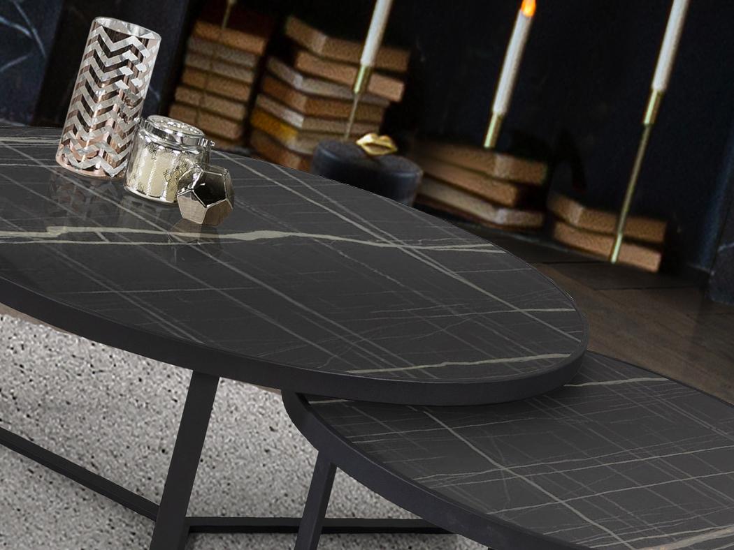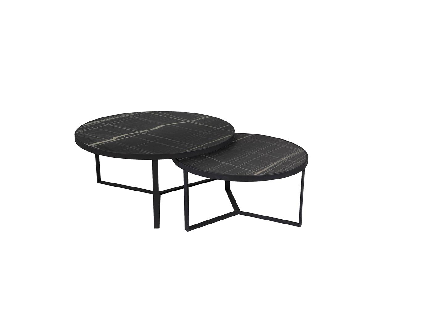 Комплект приставных столиков из металла черного матового цвета. Столешница из МДФ с высокостойкой меламиновой поверхностью и отделкой из глянцевого черного мрамора. Размеры стола: Ø91x41 см и Ø71x36 см.