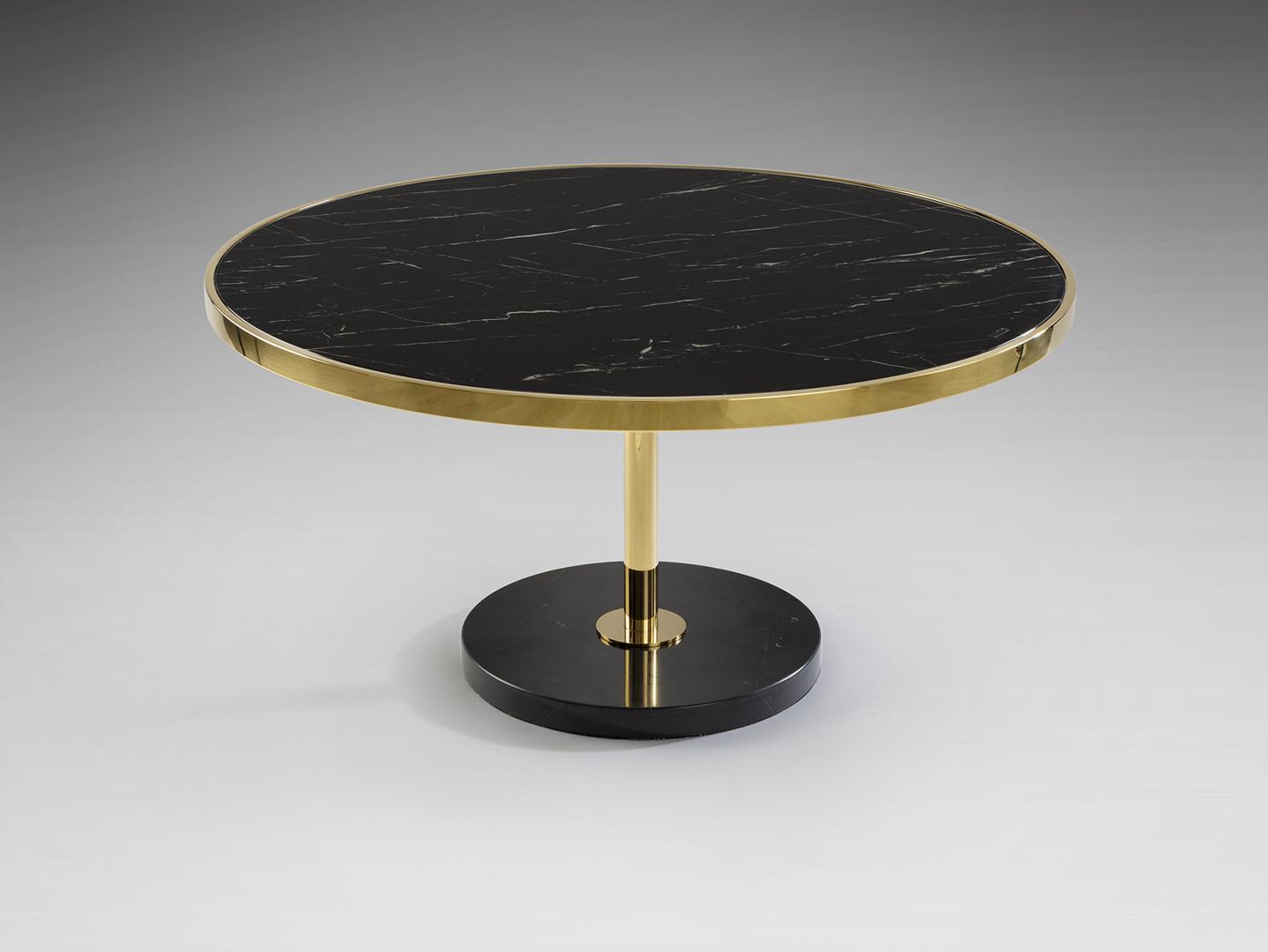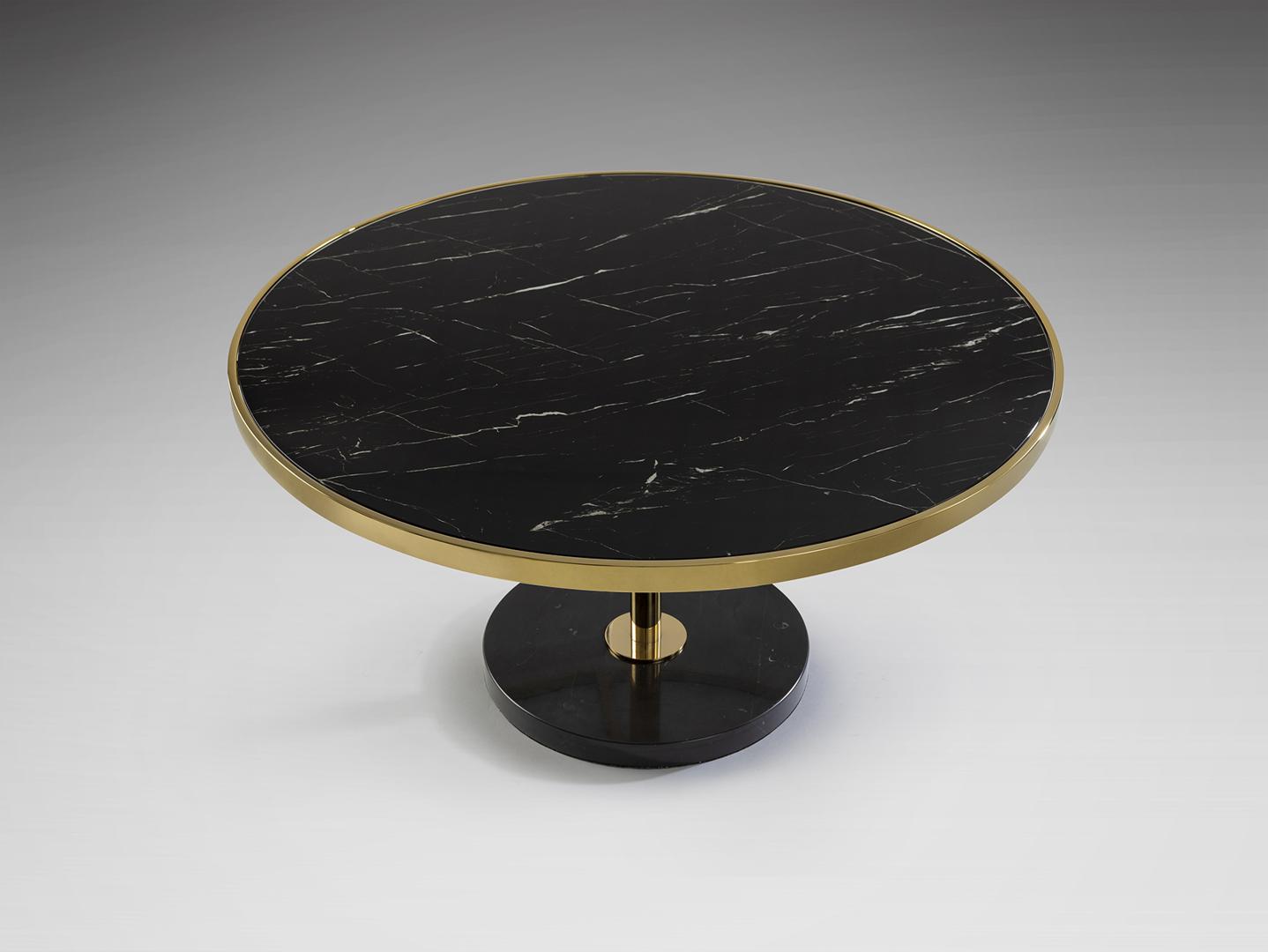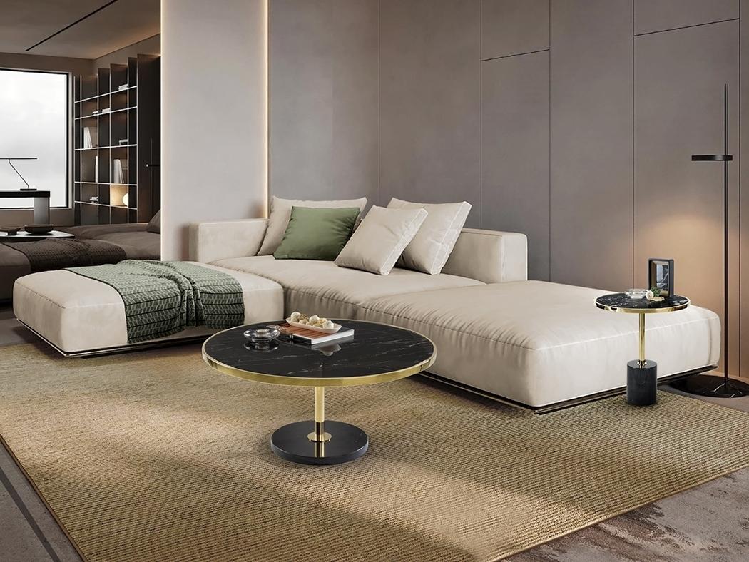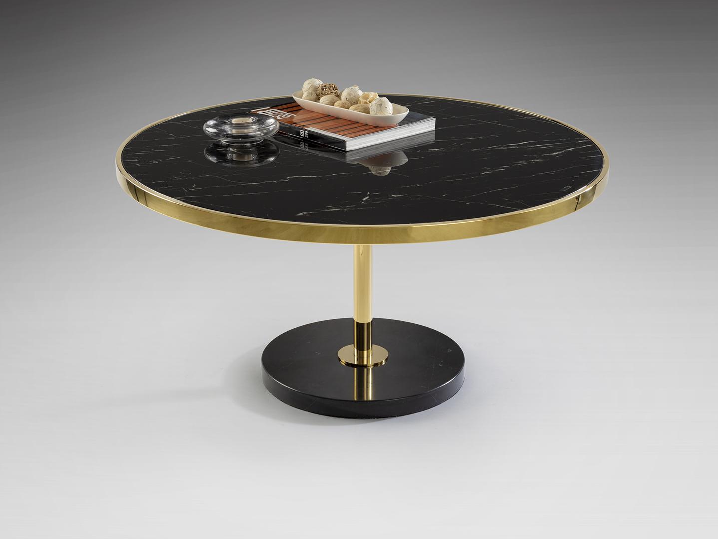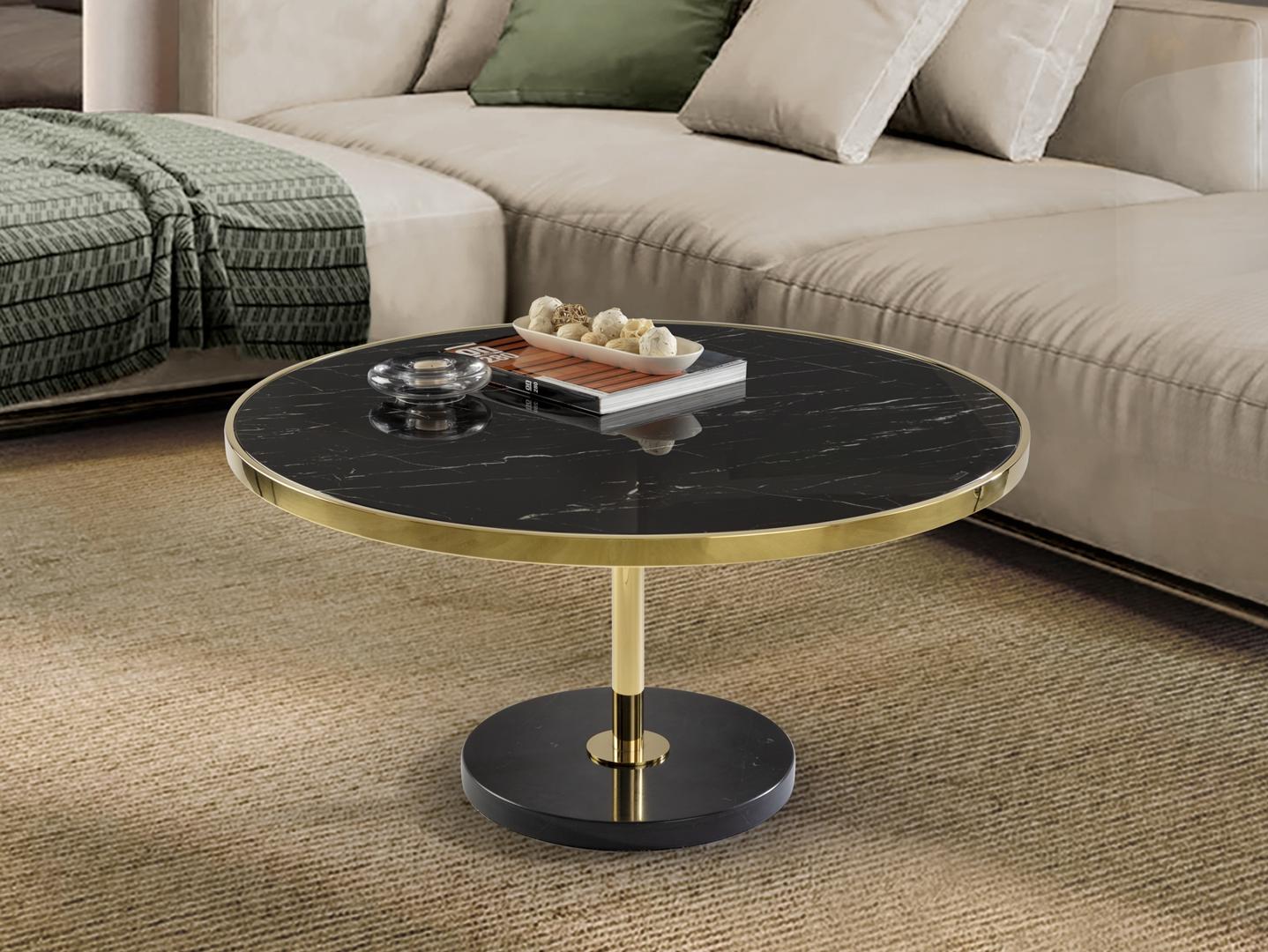 Журнальный столик из нержавеющей стали, позолоченная отделка. Основание из черного мрамора и столешница из закаленного стекла с отделкой под черный мрамор.