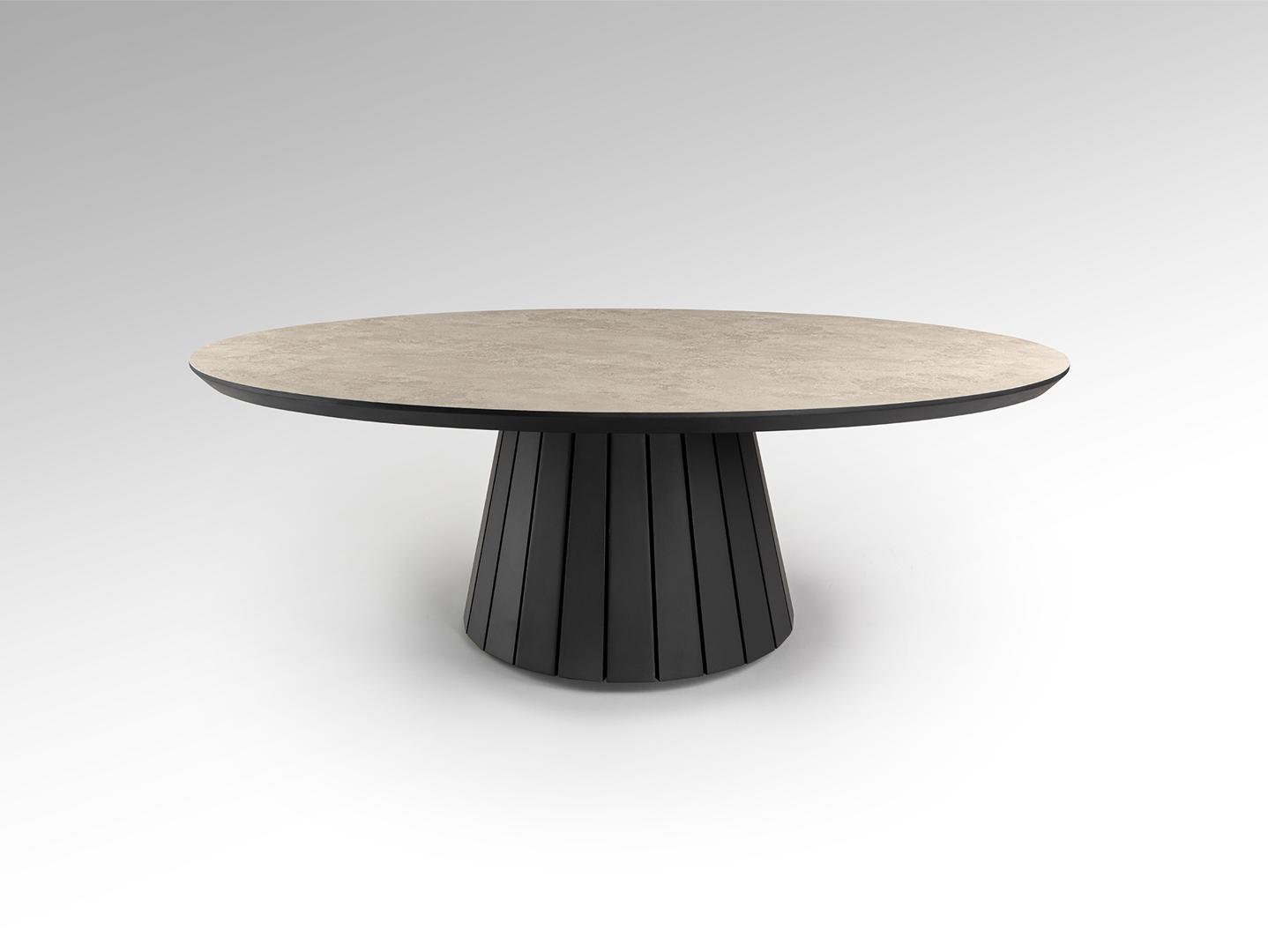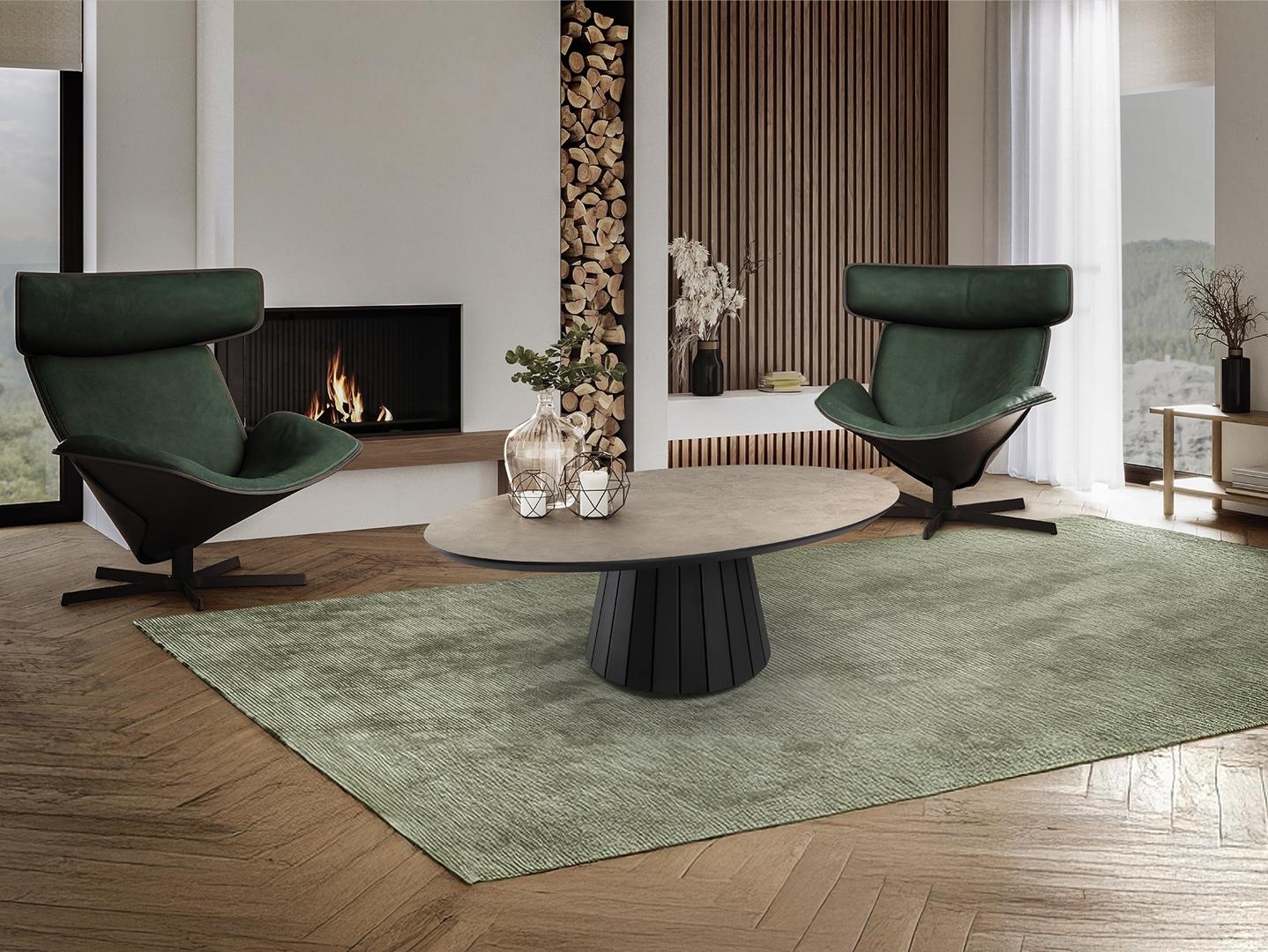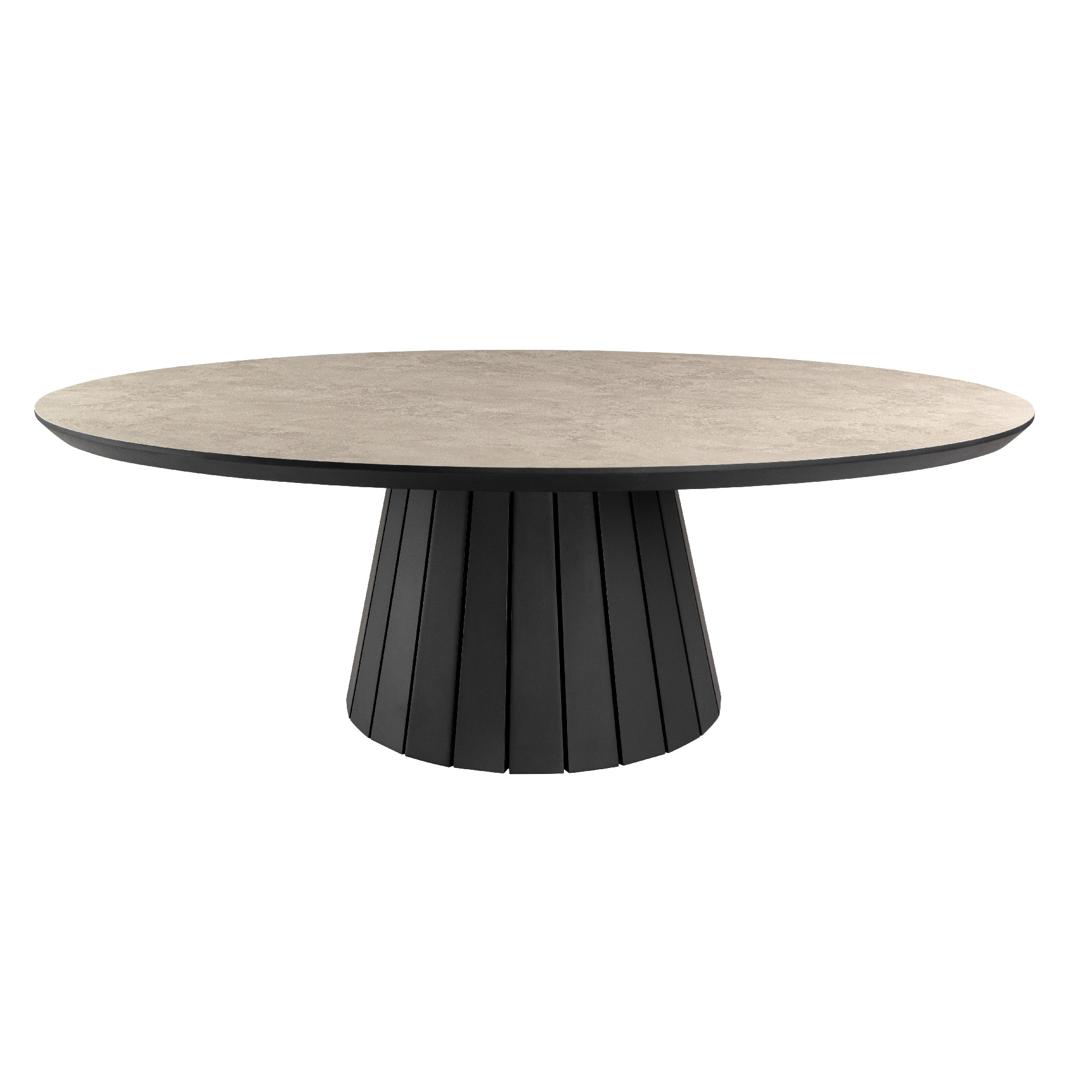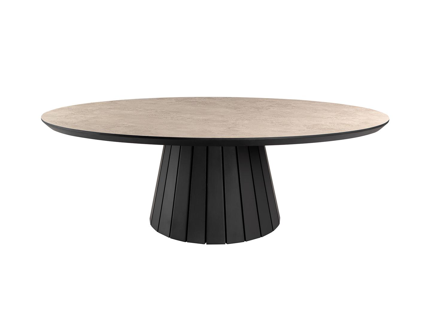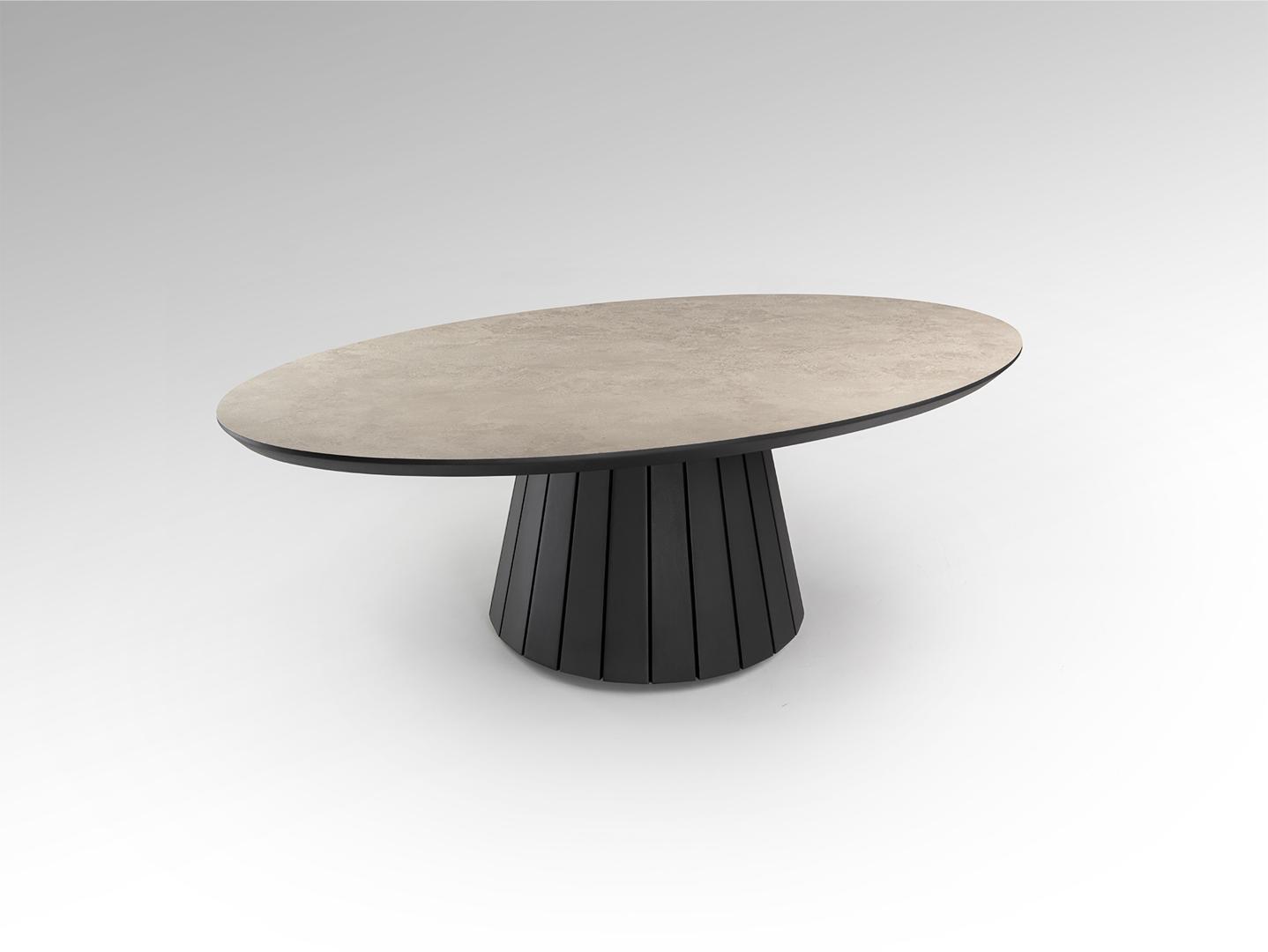 Овальный журнальный столик, каркас из МДФ с матовым черным покрытием. Столешница из МДФ с высокопрочным меламиновым покрытием, с матовой отделкой под камень и матовыми черными кромками.