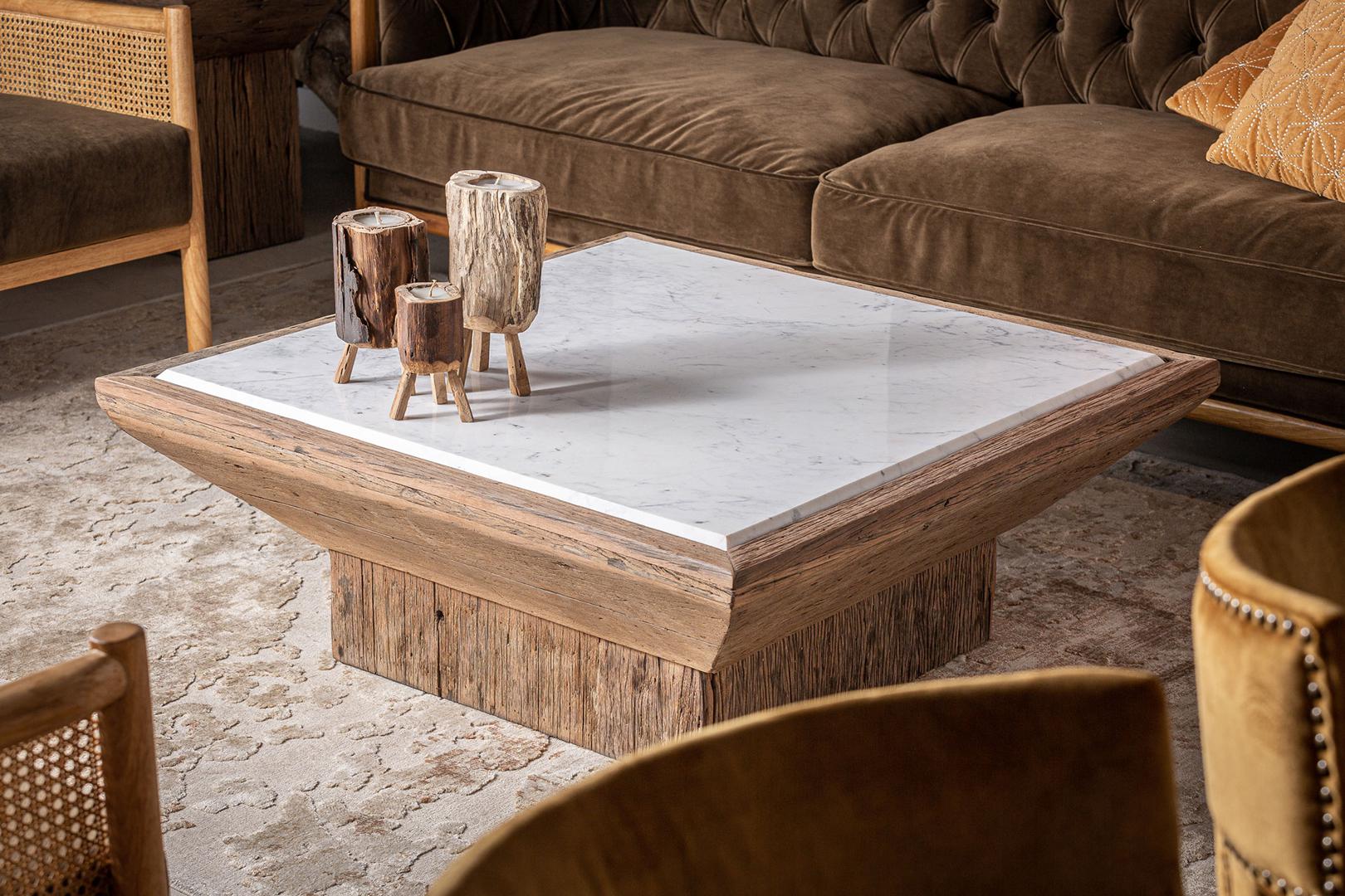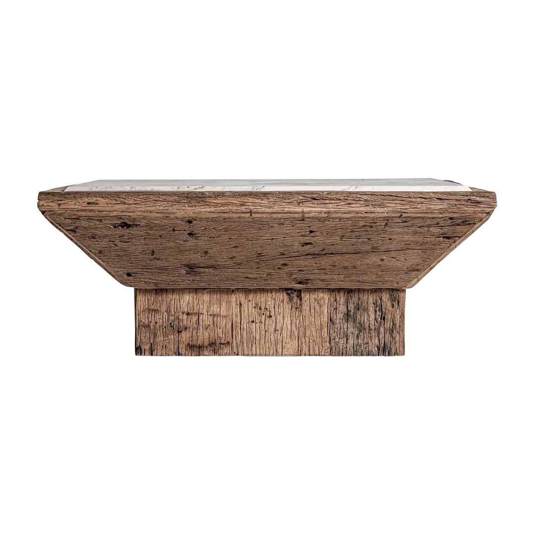 Журнальный столик Samsung, цвет натуральный/состаренный белый, в этническом стиле. Изготовлен из переработанной сосновой древесины в сочетании с мрамором. Различные породы дерева: сосна, манго, тик, акация.