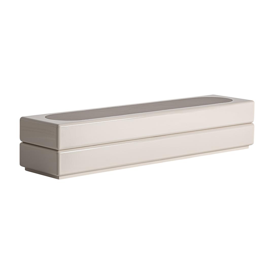 Журнальный столик из МДФ в сочетании с бежевым полиуретаном коричневого цвета. Ширина: 140 см, Глубина: 35 см, Высота: 29 см