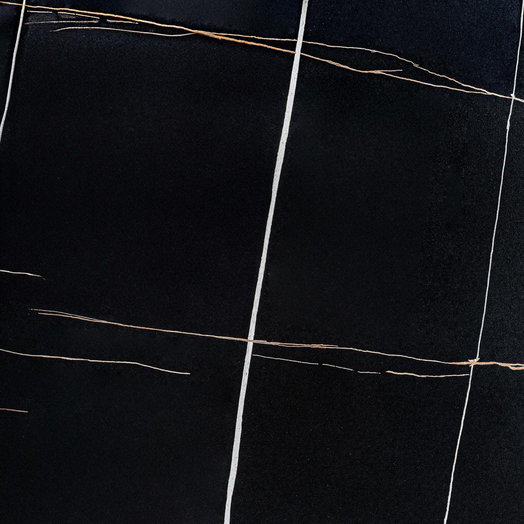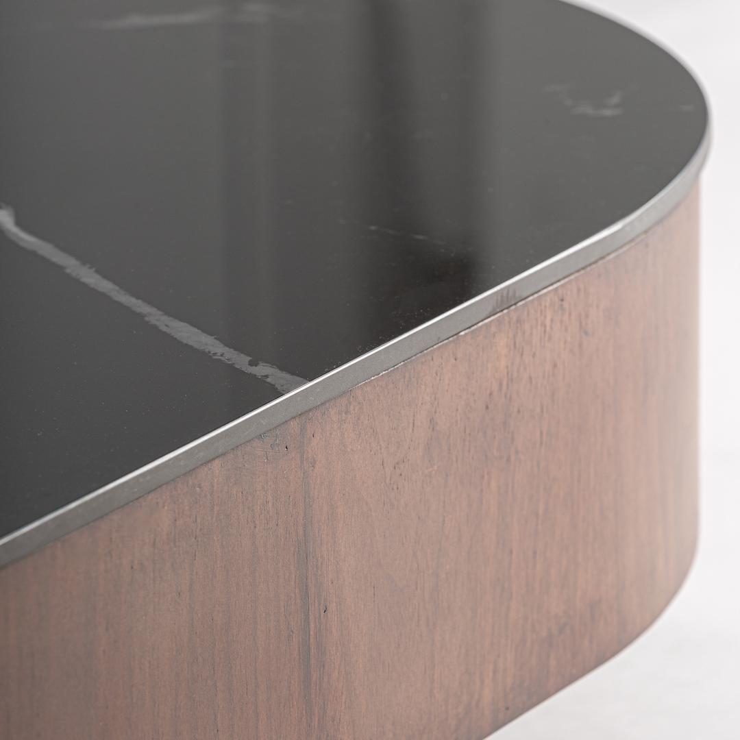 Современный журнальный столик Neufs, изготовленный из черного синтетического мрамора в сочетании с коричневой фанерой и ореховым шпоном. Ширина: 70 см, Глубина: 70 см, Высота: 35 см
