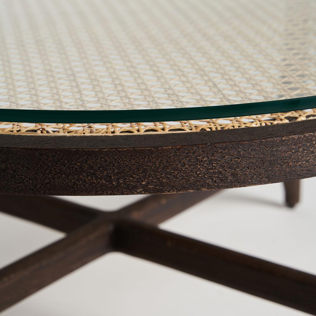 Журнальный столик nossen, коричневый цвет, колониальный стиль. Изготовлен из древесины манго в сочетании со стеклом и ротангом.
