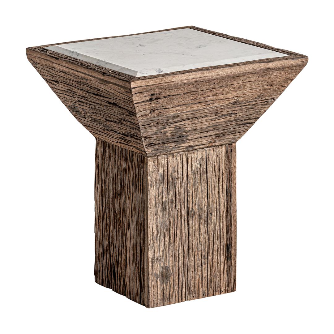Приставной столик Samsung, цвет натуральный/состаренный белый, в этническом стиле. Изготовлен из переработанной сосновой древесины в сочетании с мрамором. Различные породы дерева: сосна, манго, тик, акация.