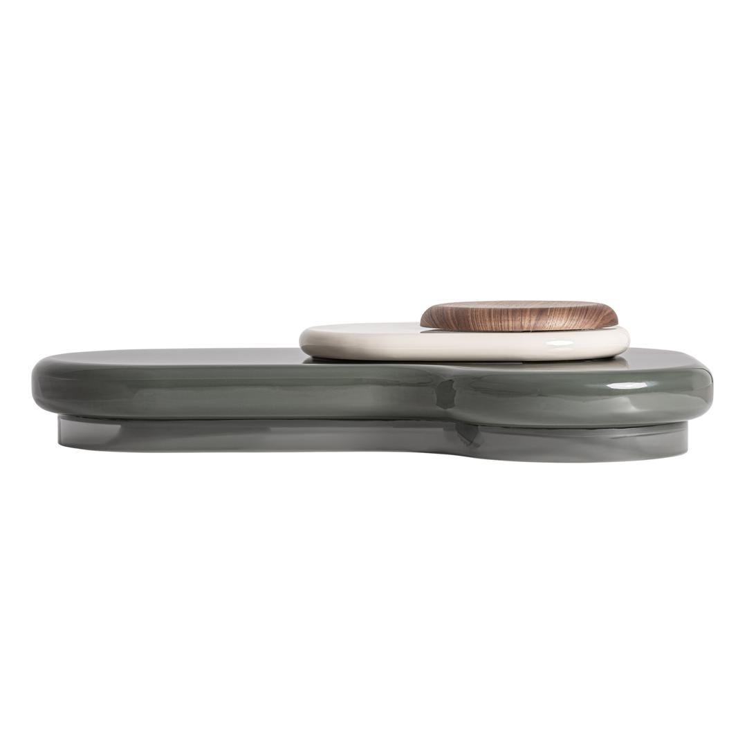 Журнальный столик из зеленого МДФ в сочетании с ореховым шпоном кремового цвета коричневого цвета. Ширина: 120 см, Глубина: 70 см, Высота: 26 см