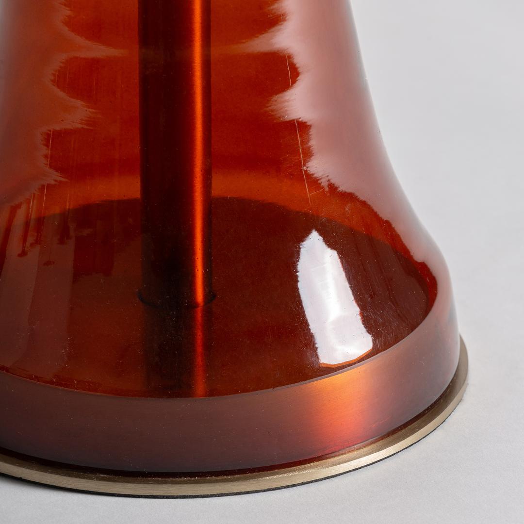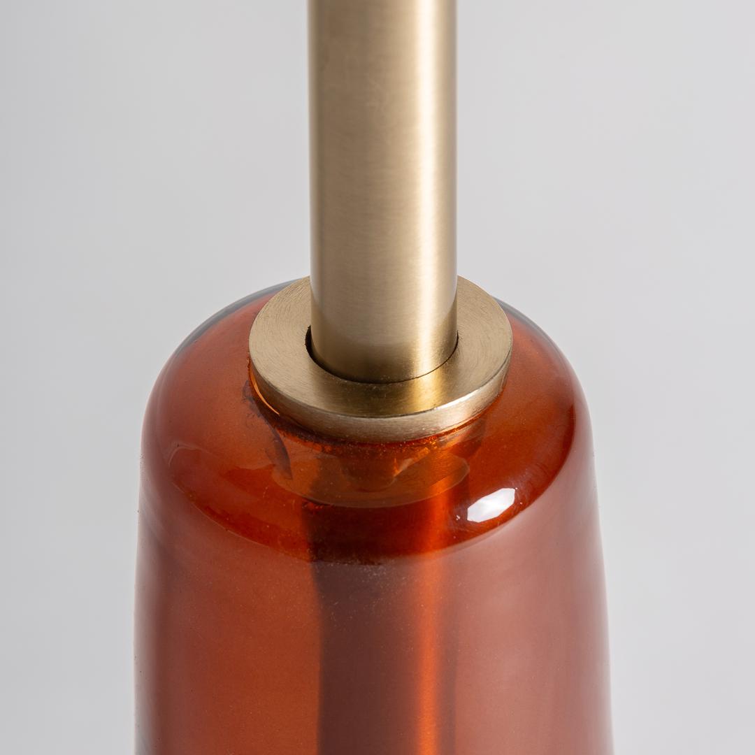 Приставной столик Colmar с тонким силуэтом и отделкой из янтарного стекла привносит тепло и стиль, подчеркнутые деталями из золотистого металла и изысканной поверхностью.