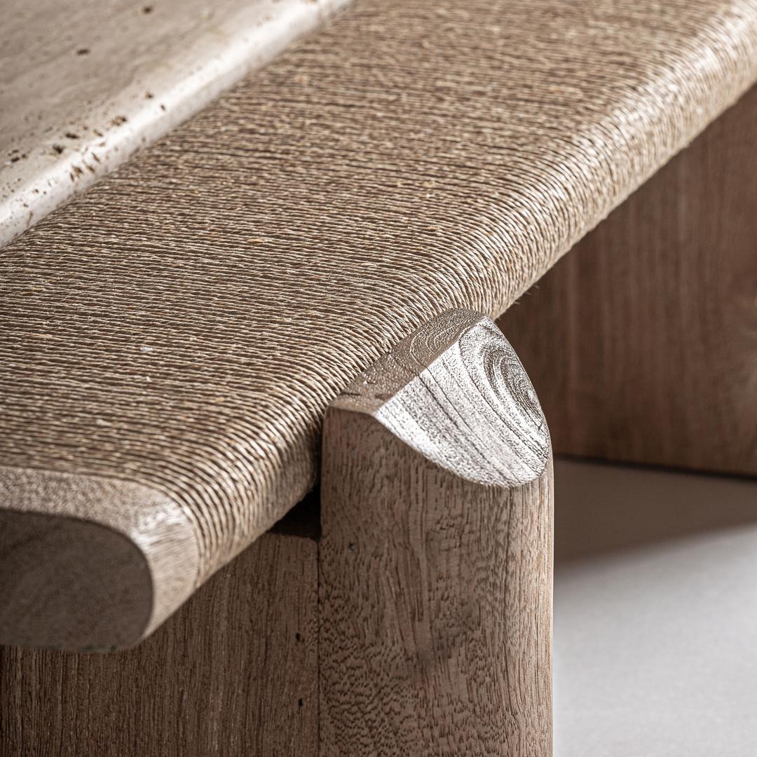 Журнальный столик из жаккарда в современном стиле. Изготовлен из мангового дерева коричневого цвета в сочетании с мрамором коричневого цвета. Изделие разборное.