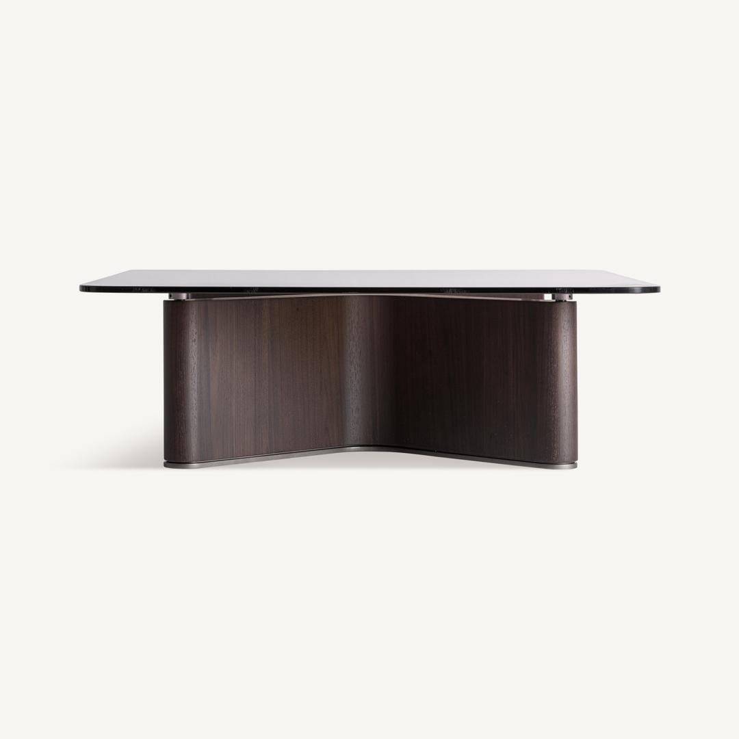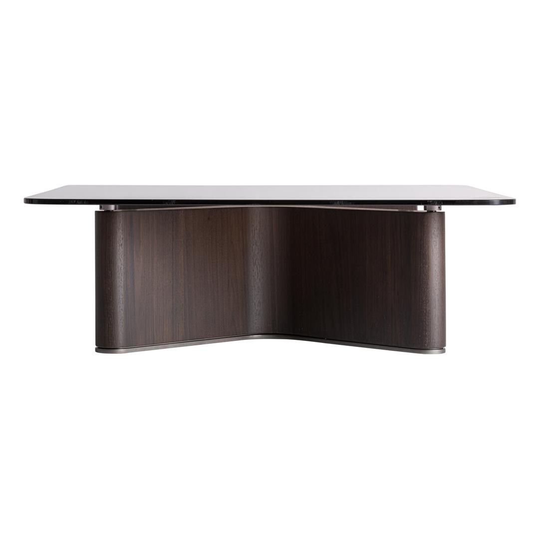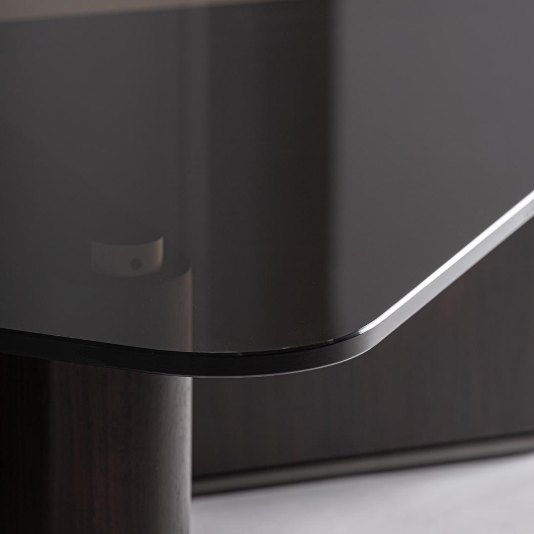 Современный журнальный столик Bransby из чёрного ясеня в сочетании с серым закалённым стеклом. Изделие можно разобрать. Ширина: 100 см, Глубина: 100 см, Высота: 33 см