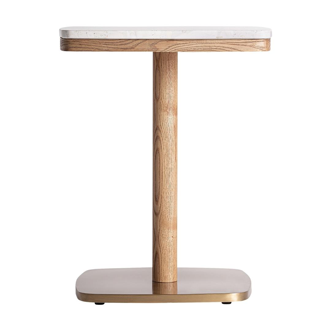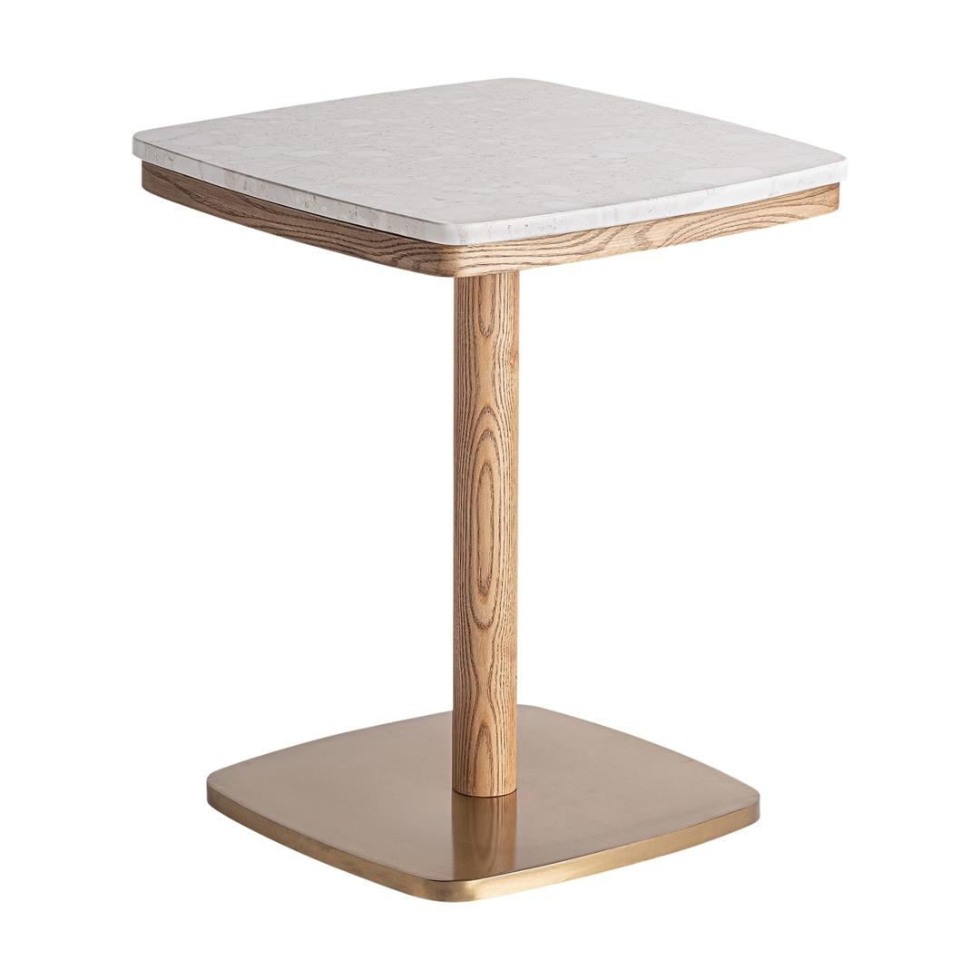 Барный стол Alferce, цвет белый/золотой, стиль арт-деко. Изготовлен из терраццо в сочетании со сталью и деревом.